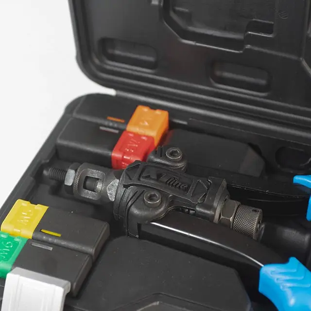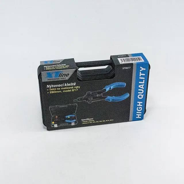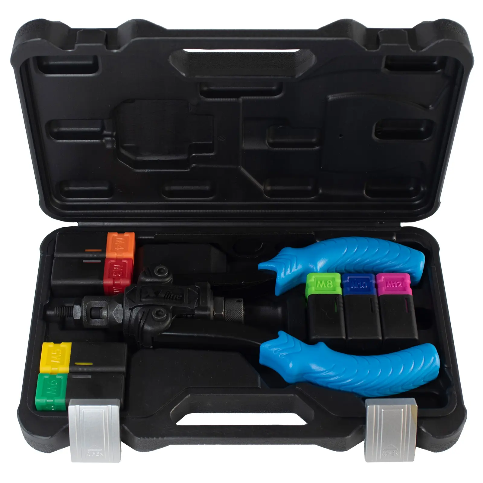 Nýtovací litinové kleště mají vysokotvrzenou ergonomickou konstrukci, jež je určena do těžkých provozů. Ocelová páka kleští a tvarovaná rukojeť snižují vynaložené úsilí při nýtování. Komfort při práci zajišťuje odolné lehké tělo z hliníkové slitiny, tvrzené Cr-Mo čelisti, koncovky pro maticové nýty M3, M4, M5, M6, M8, M10, M12 a klíč pro výměnu koncovek. Kleště jsou v plastovém boxu s nýtovacími nástavci.