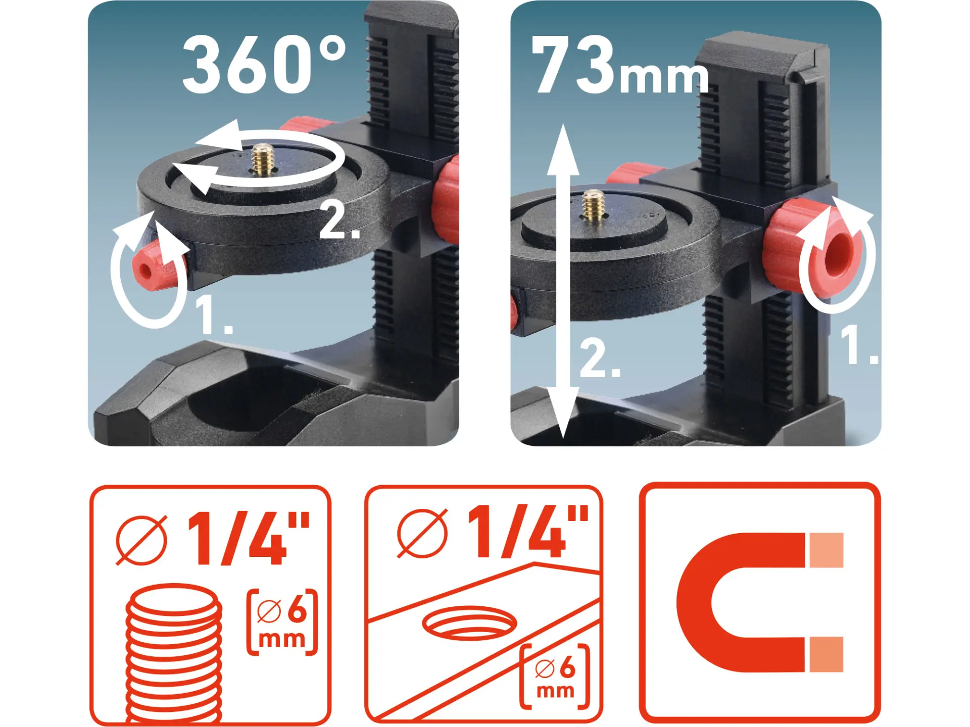 • výškově stavitelná základna se šroubem 1/4" pro uchycení koncového (laserového či jiného) zařízení a dalšími možnostmi upevnění držáku :• pomocí magnetů např na kov. zárubně, konstrukce, zábradlí atp.• šroubem/vrutem jej lze upevnit na zeď, sádrokarton, dřevěnou konstrukci atd.• nylonovým (jiným) páskem na tyč, hranol, konstrukci atp.• položením na vodorovnou plochu