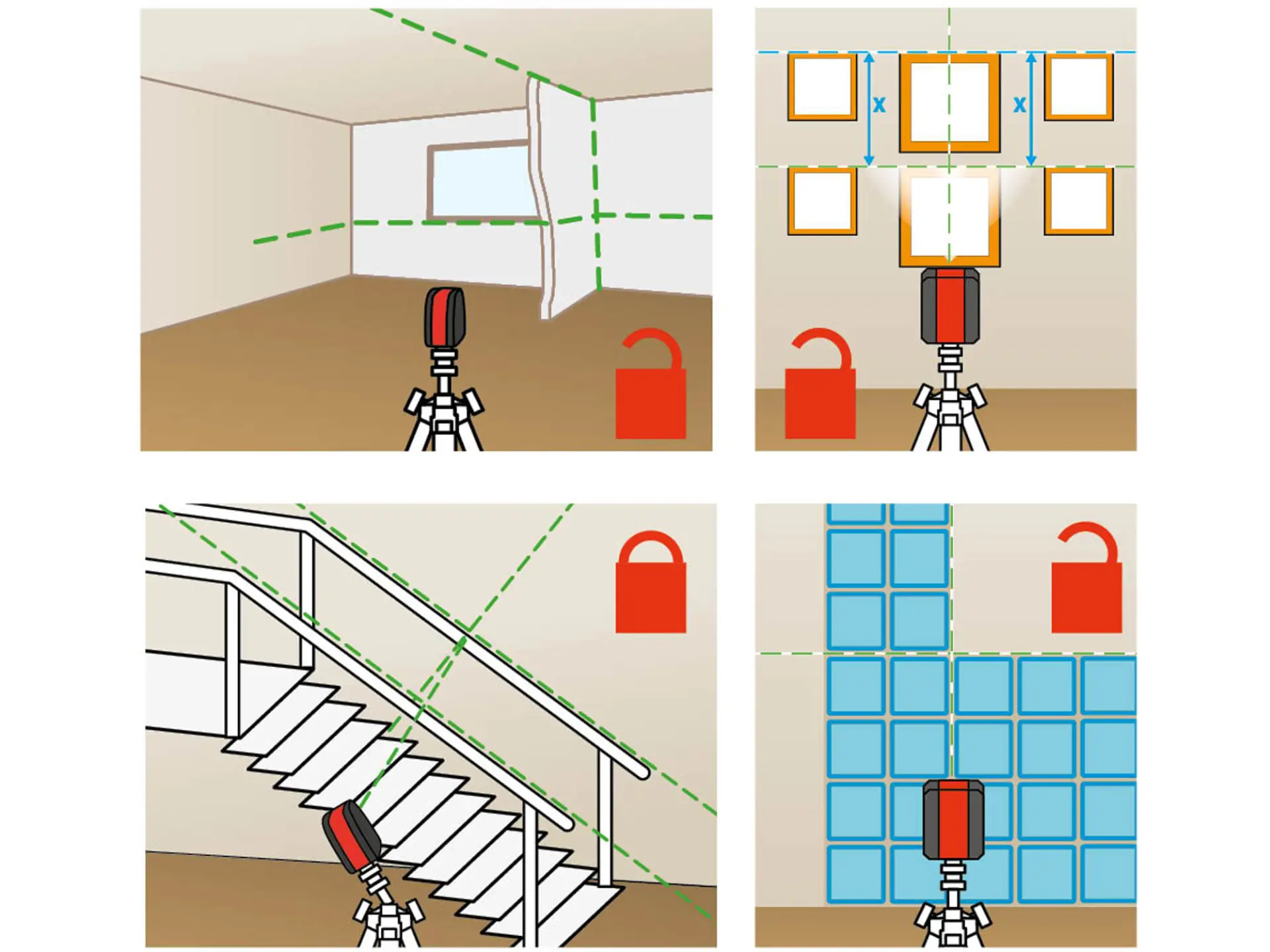 • samonivelační funkce: díky vysoce kvalitní mechanice se paprsek laseru během krátké chvíle samočinně seřídí do přesné polohy