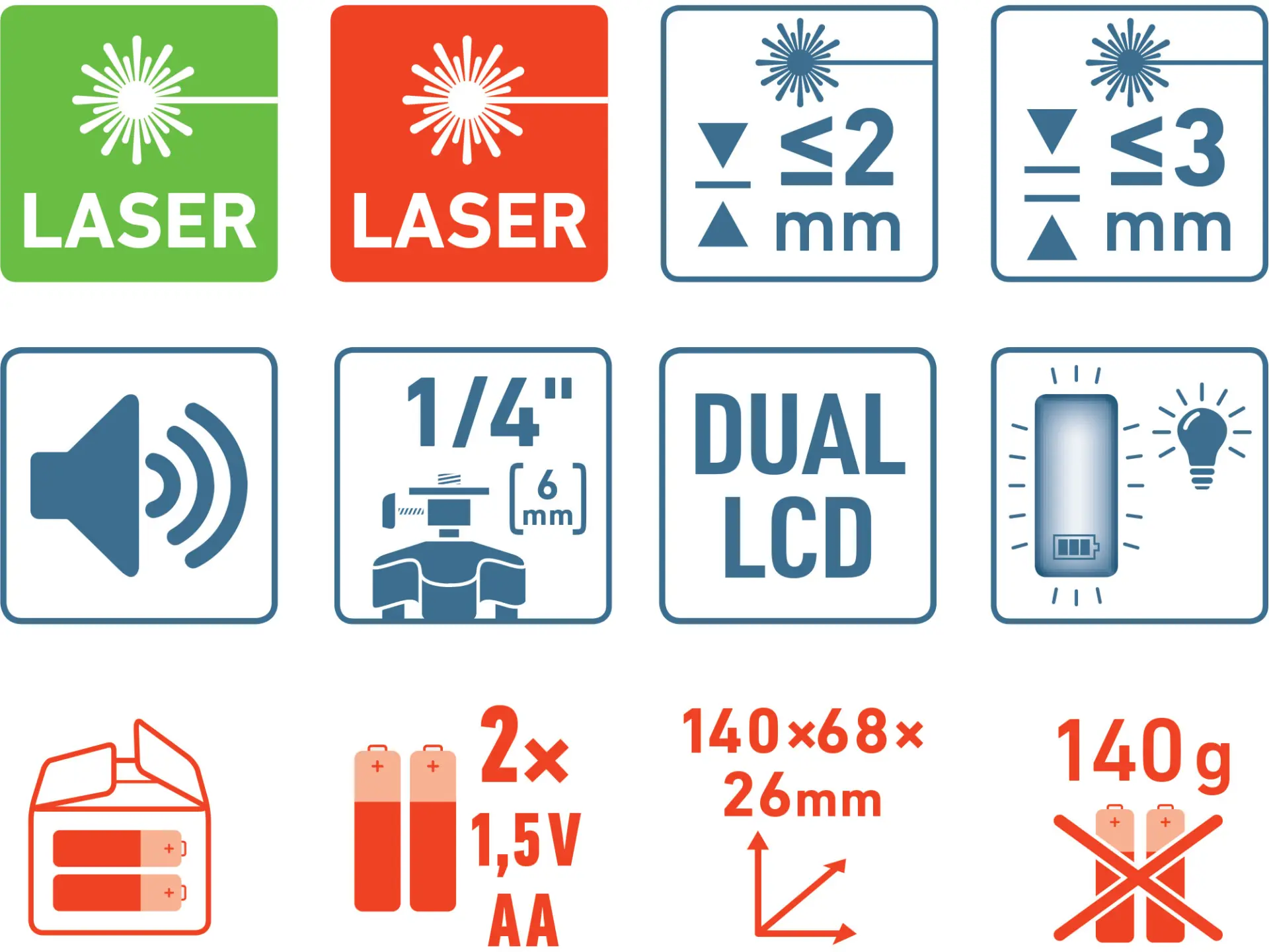 vzdálenost detekce min. 50m (závisí na světelných podmínkách), přesnost s odchylkou do 2-3mm, použitelnost v rozmezí teplot od -10°C do +50°C, napájení 2x1,5V AA baterie