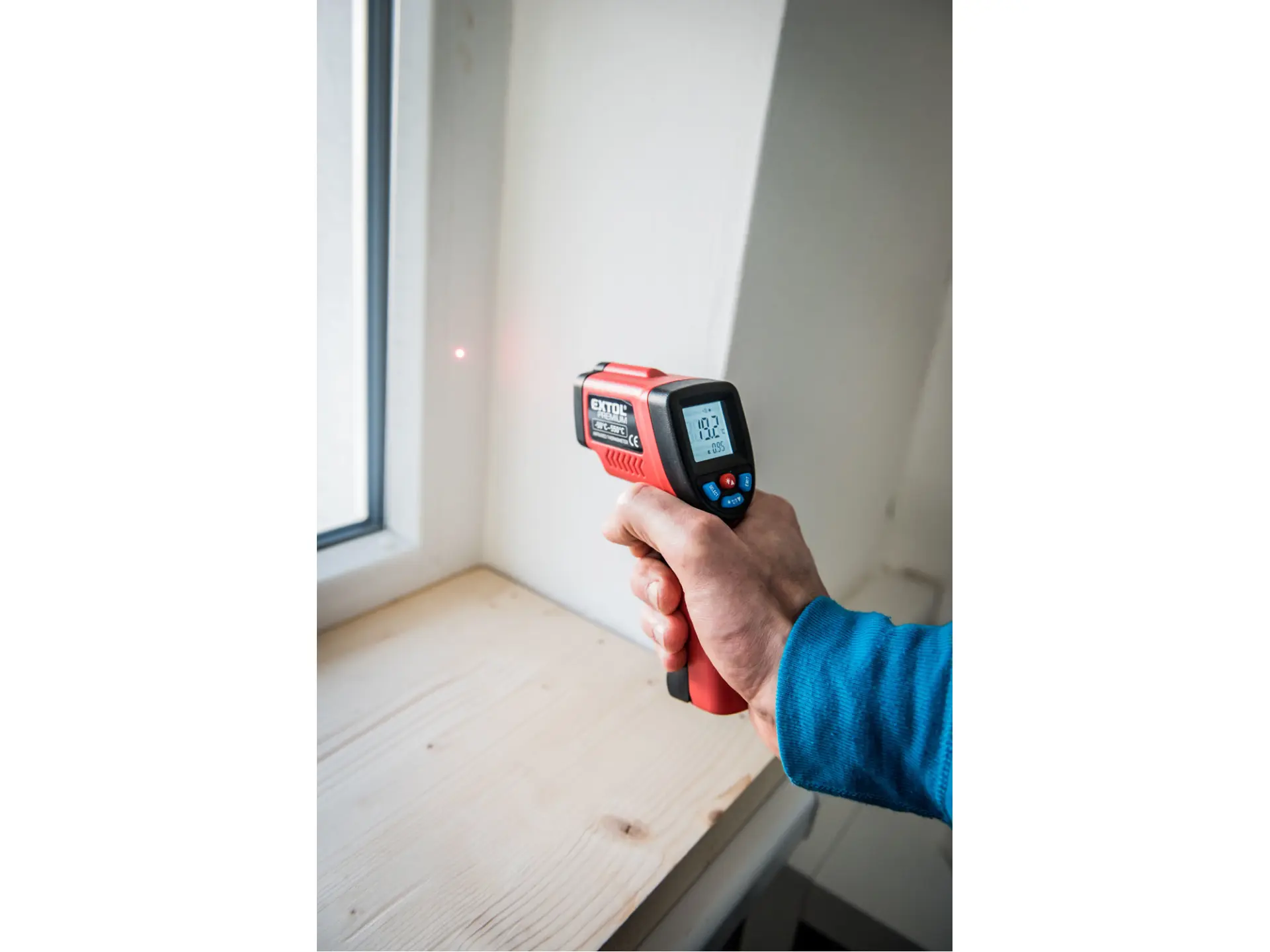 • jednobodové laserové ukazovátko signalizuje střed kruhové plochy, ve které probíhá měření. Optické rozlišení, tedy poměr mezi vzdáleností přístroje a průměrem této kruhové měřené plochy je konstantně nastaven na 12:1.