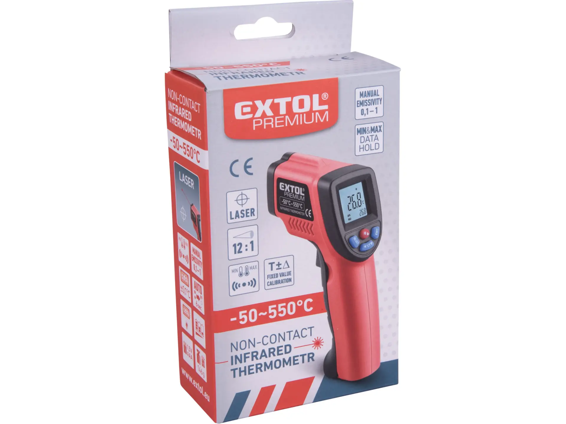• možnost nastavení emisivity (vyzařování jednotlivých materiálů) v rozmezí 0,1-1,0 (dle hodnot v návodu) spolu s možností vlastní kalibrací přístroje lze dosáhnout přesnějších výsledků měření