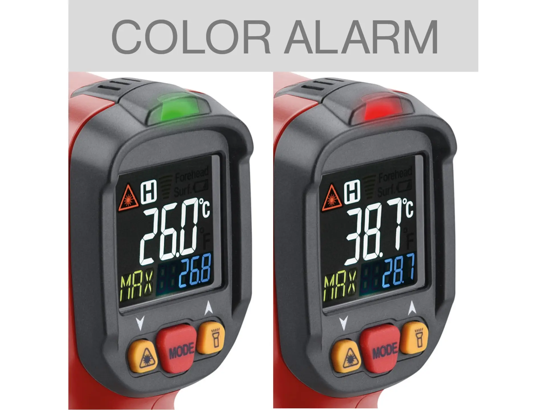 • světelná, barevná indikace při kontrolním měření libovolně nastavené teploty. Lze nastavit indikaci pokud je teplota pod/nebo nad zvolenou hodnotou