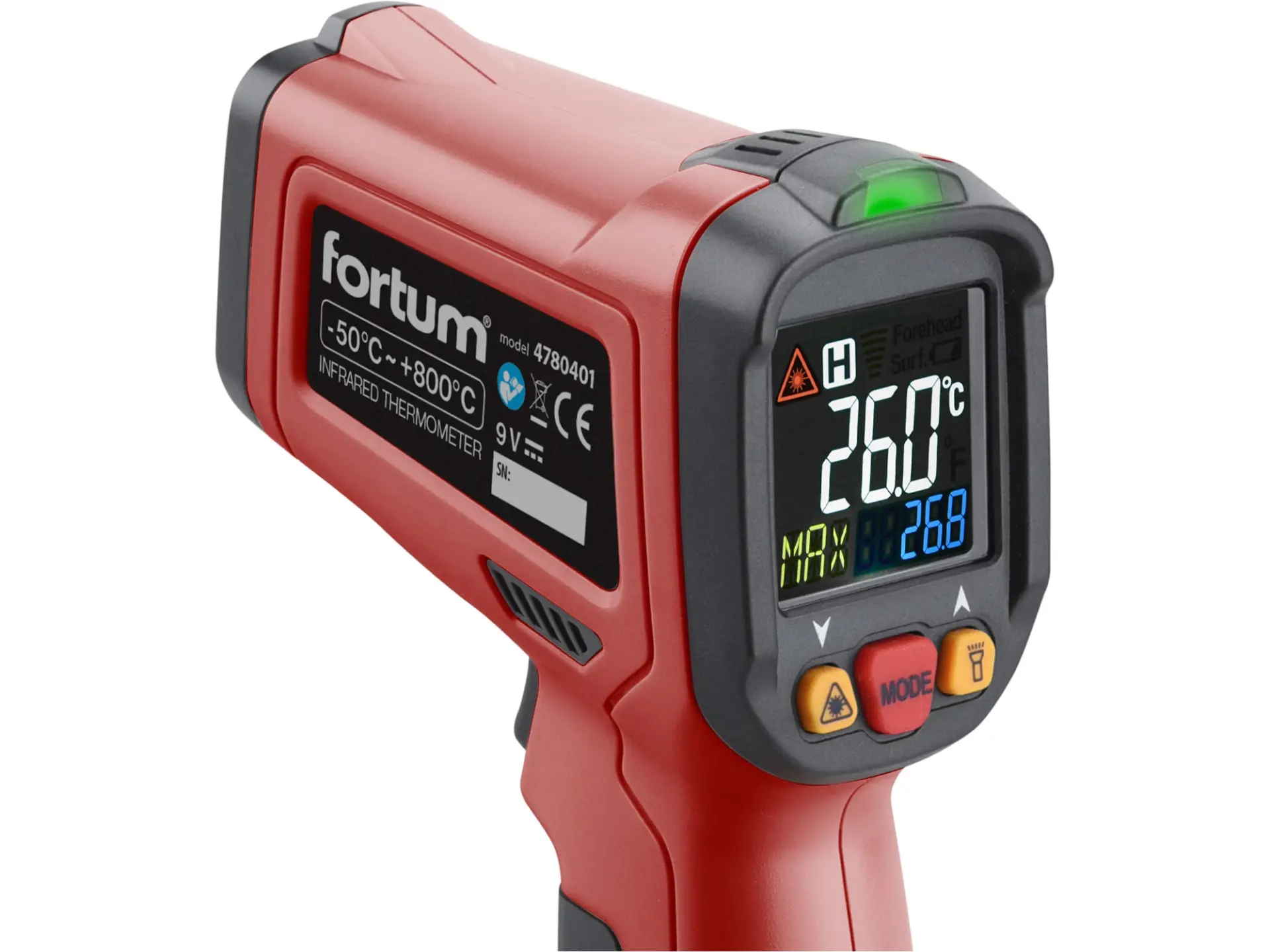 • 12-ti bodové laserové ukazovátko signalizuje celou kruhovou plochu, ve které probíhá měření. Optické rozlišení, tedy poměr mezi vzdáleností přístroje a průměrem této kruhové měřené plochy je konstantně nastaven na 12:1.
