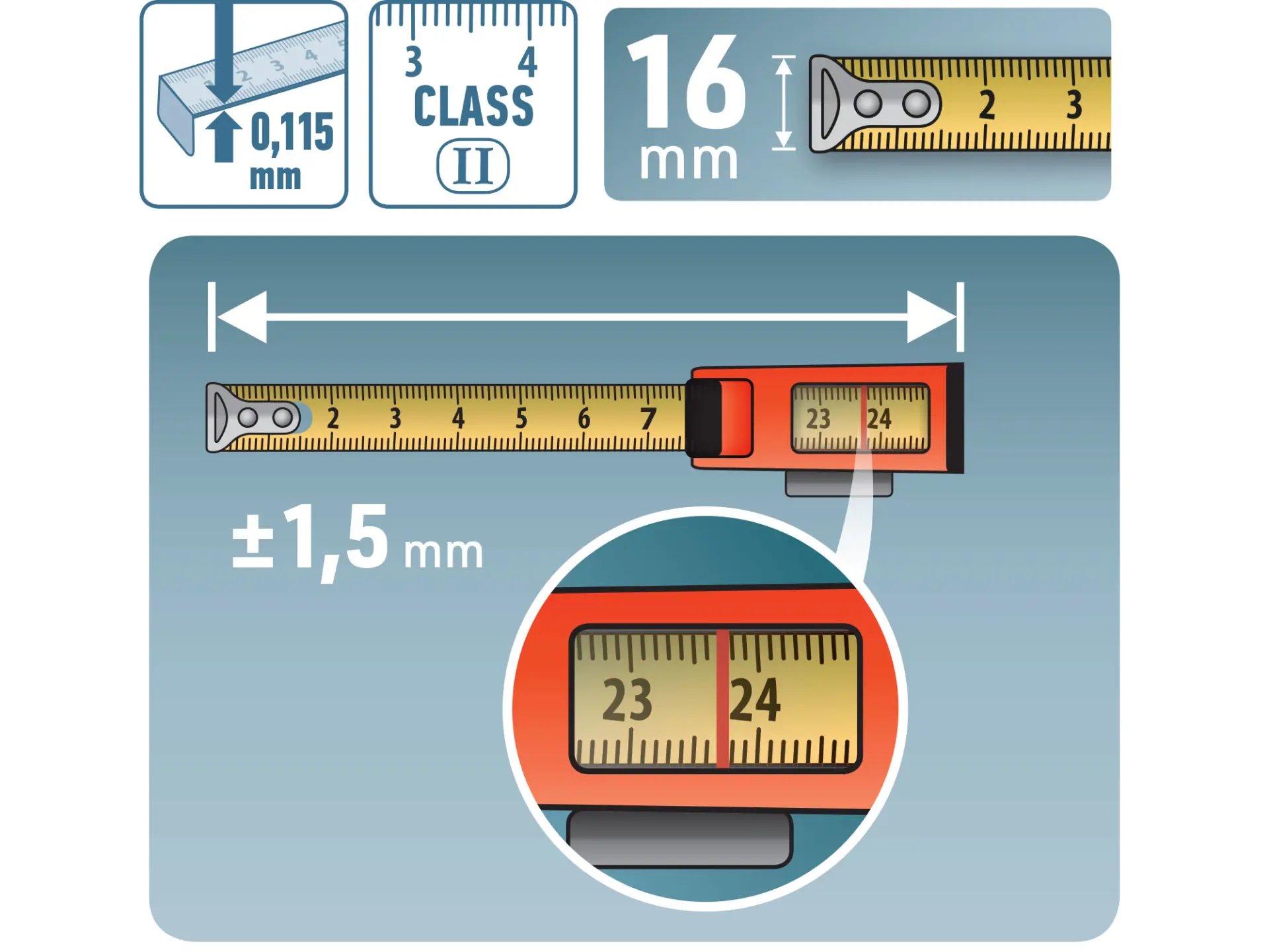 • kromě standardního přímého měření umožňuje také odečtové měření např. uvnitř ohraničeného prostoru tedy od začátku pásku až k zadní hraně krabičky metru (zde je však nutno počítat s vyšší nepřesností/odchylkou měření cca až +-1,5mm)