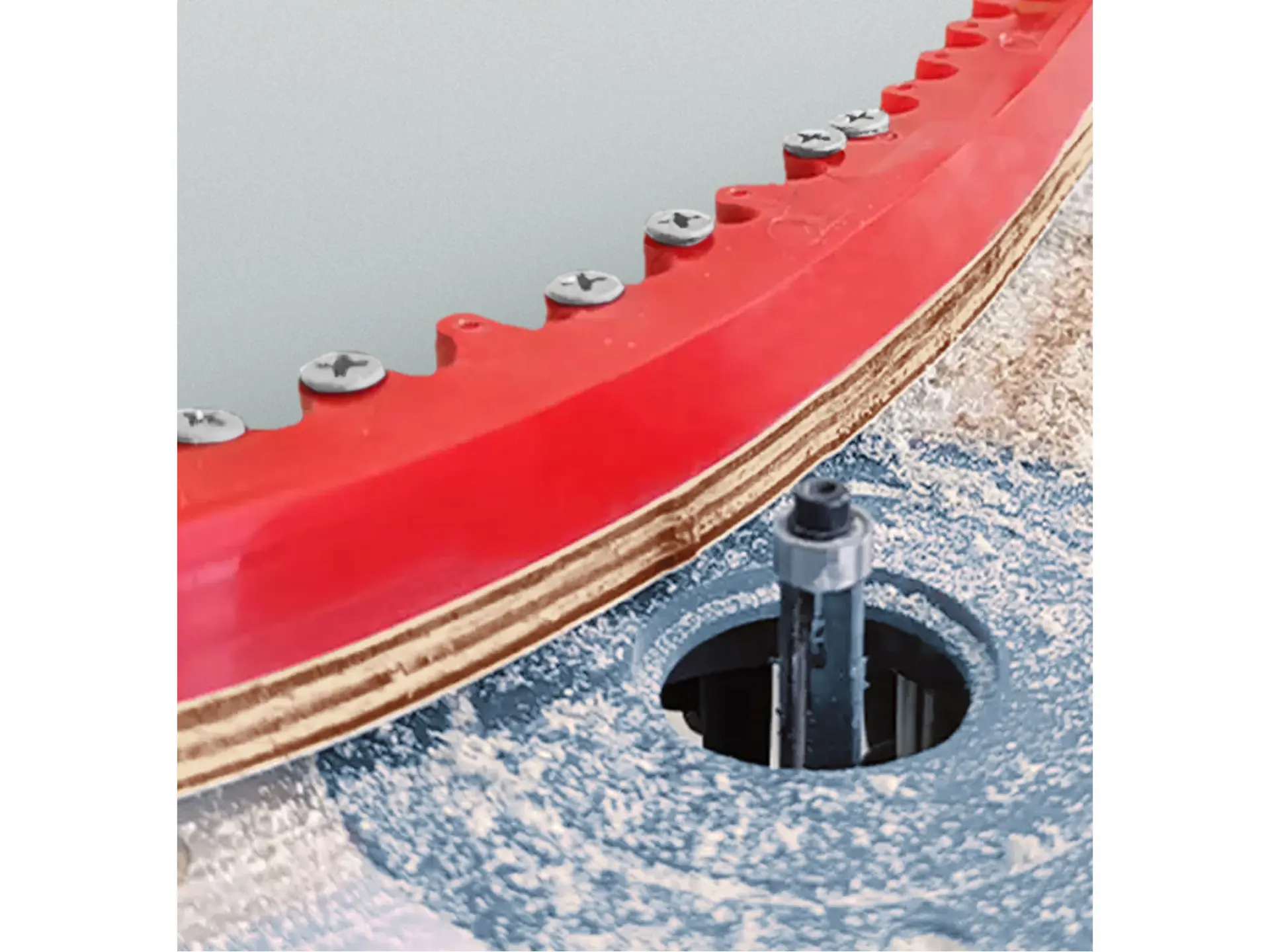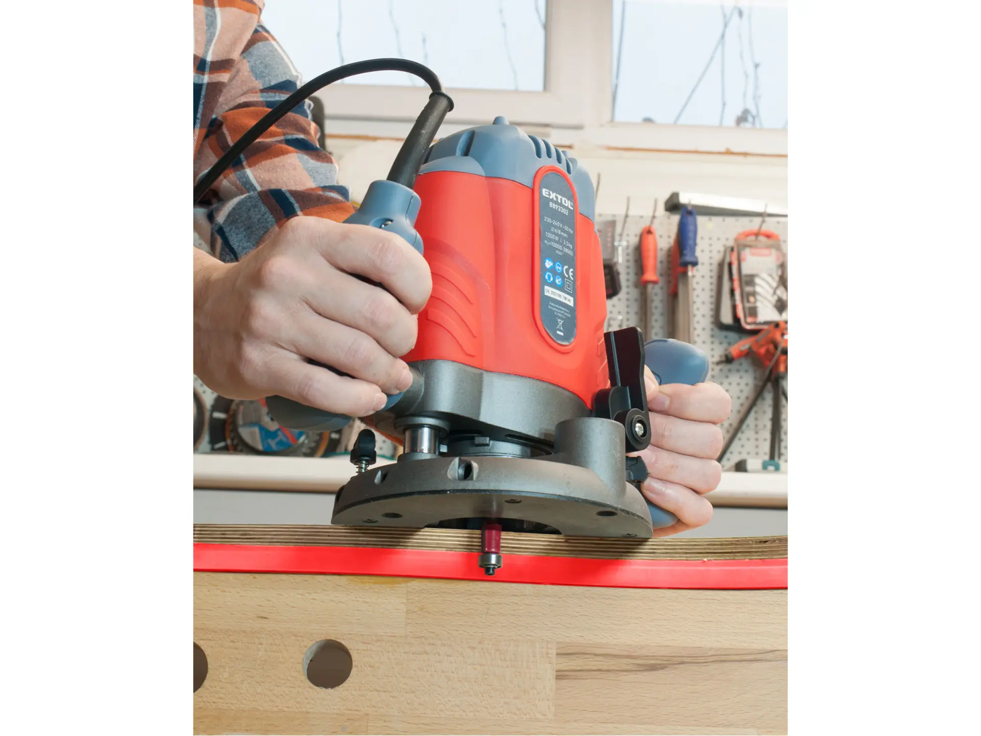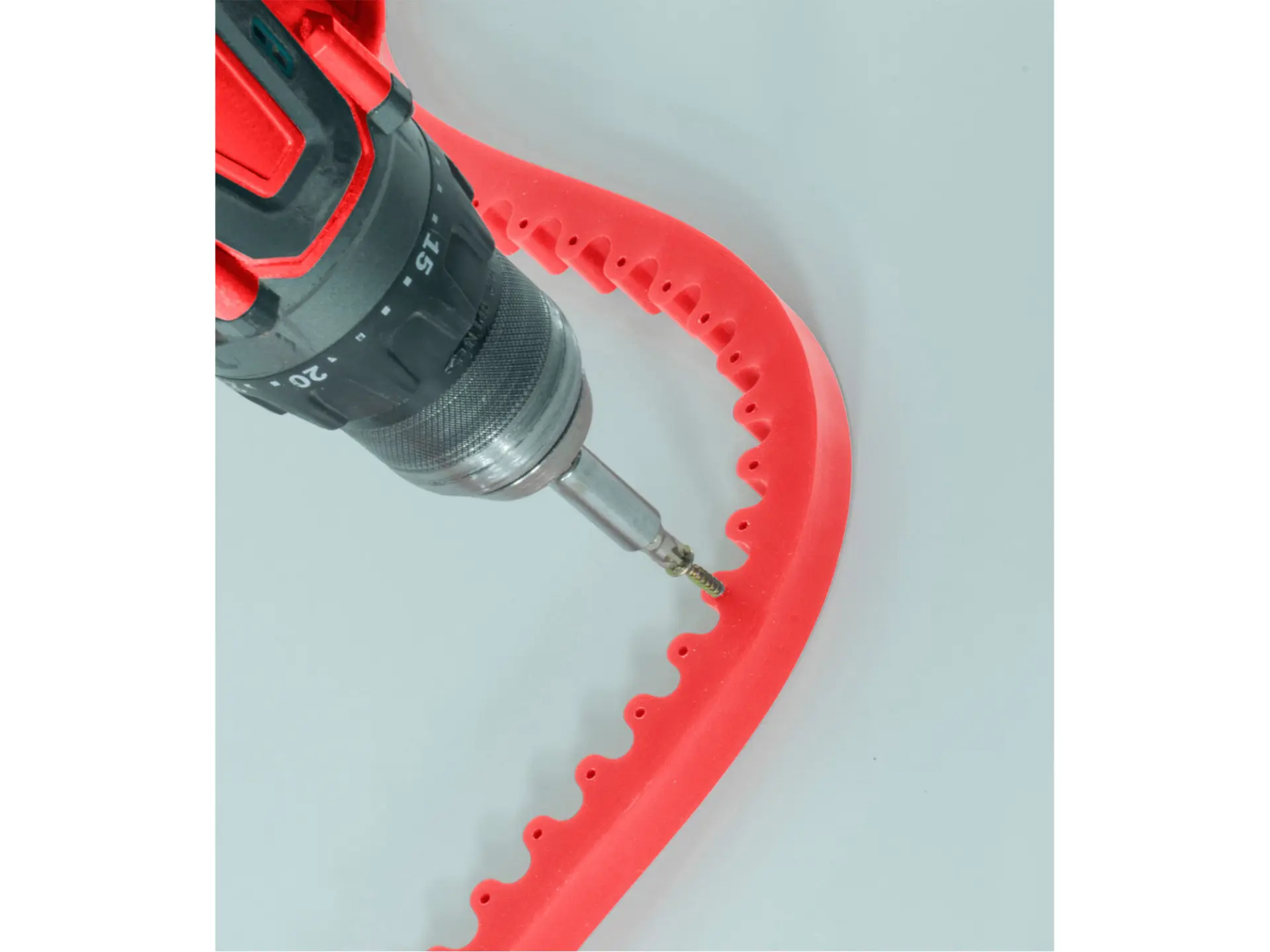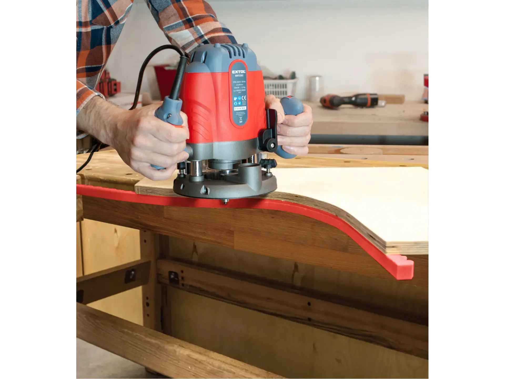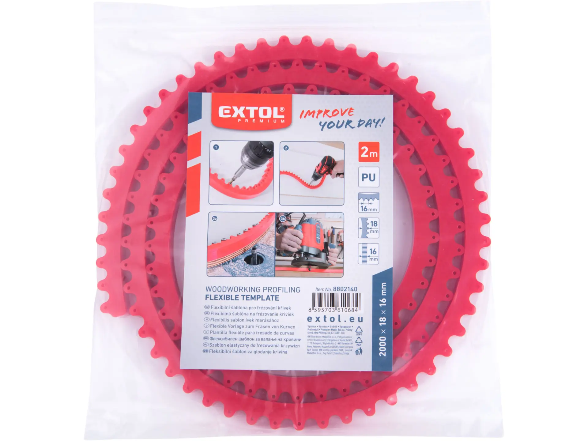 • Šablona je vyrobena z polyuretanu a pomáhá při frézování složitějších plošných tvarových struktur v dřevěných materiálech; zde lze využít její vysoké flexibility a potřebný tvar postupně fixovat pomocí vrutů - v šabloně jsou pro tento účel předpřipraveny otvory s průměrem cca 2mm (každých 1,6cm po celé její délce). Tak si můžeme připravit požadovaný tvar, který bude do materiálu vyfrézován pomocí pohybu kopírovacího ložiska frézy po šabloně.