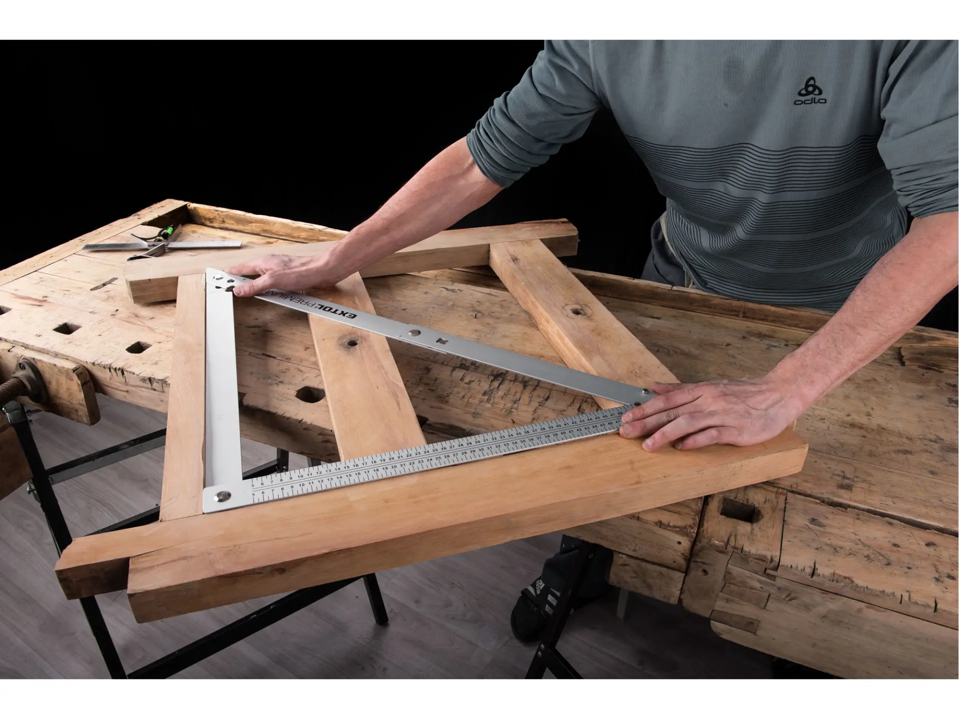 • lehká skládací kostrukce; v rozloženém stavu je úhelník pro zvýšení přesnosti vybaven fixačními prvky a výhodou je možnost úhelník po použití složit a uložit do nylonového pouzdra, které je součástí dodávky