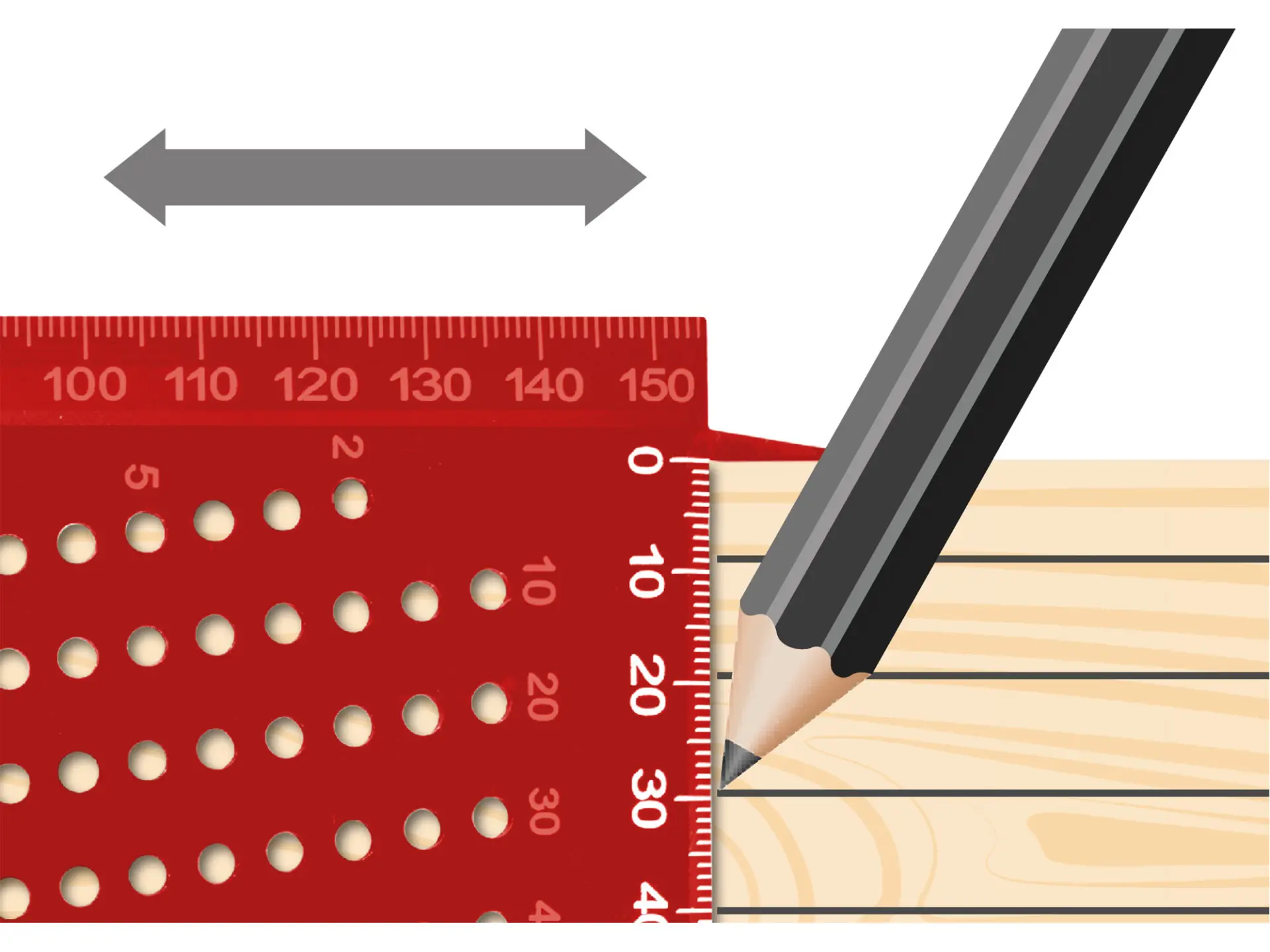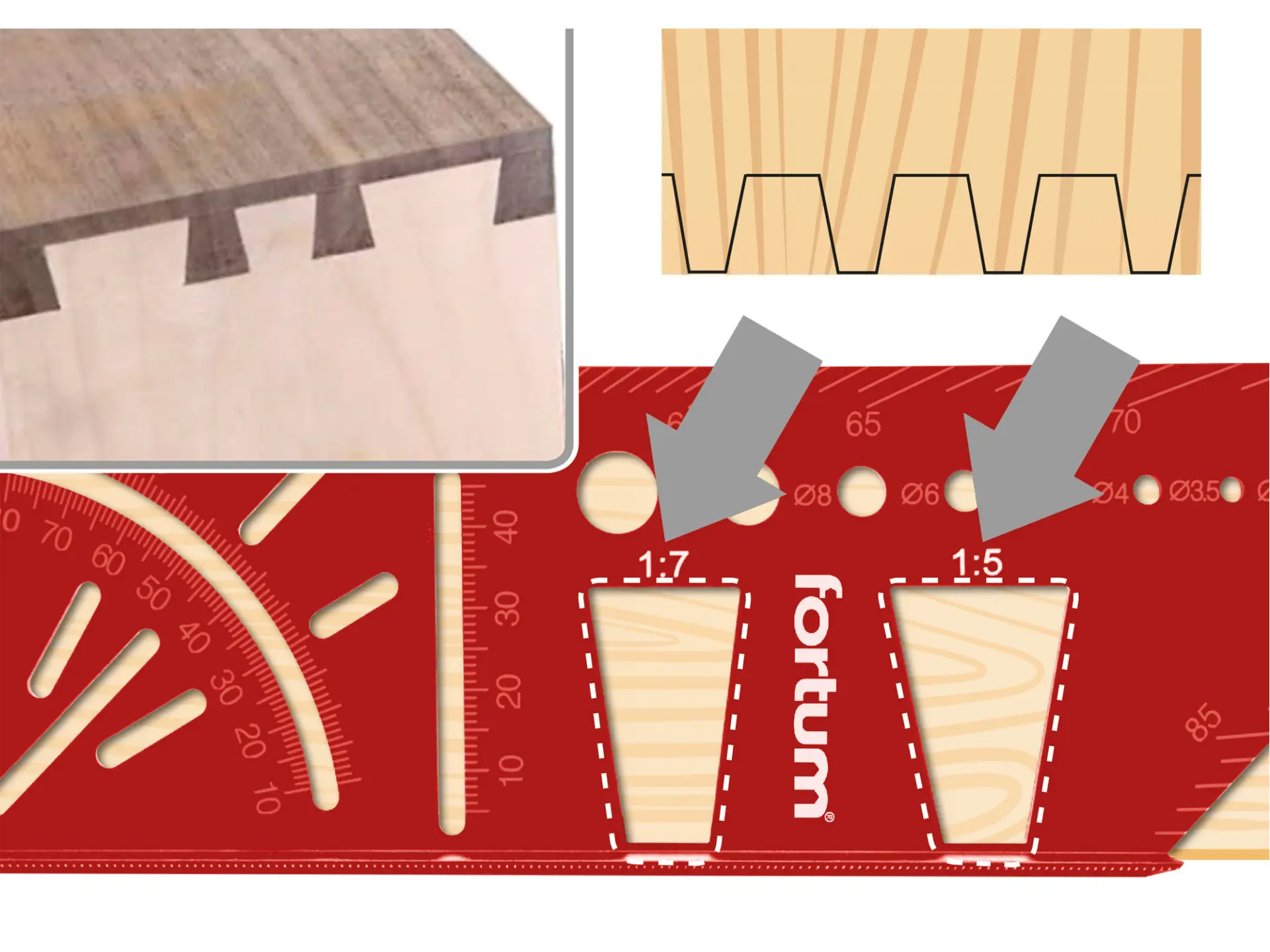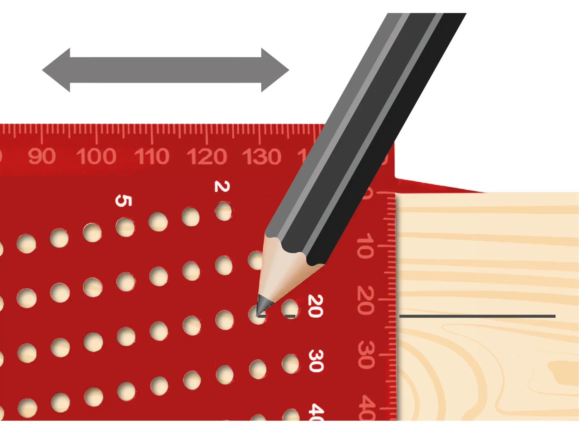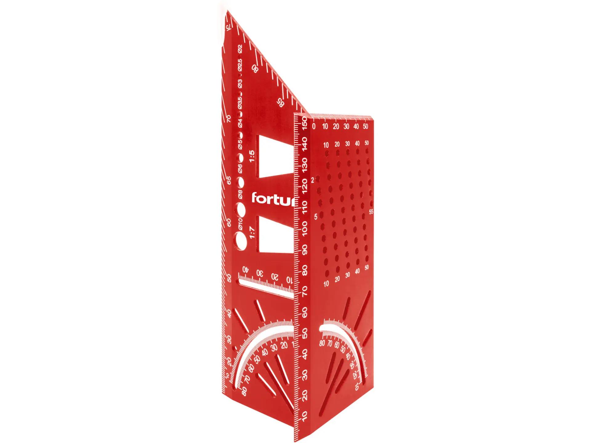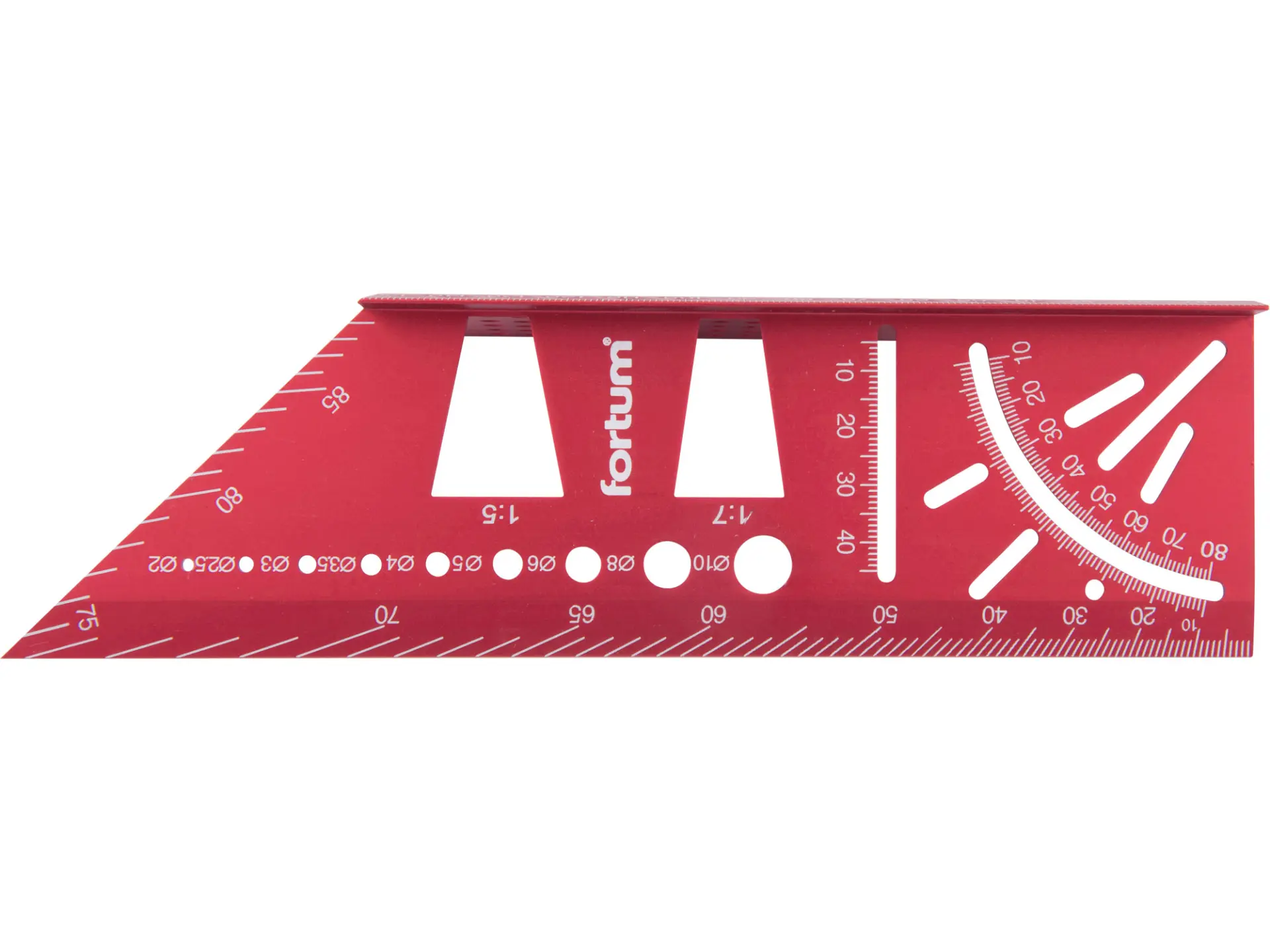 • lehký, pevný úhelník se spoustou užitečných značek, výřezů, stupnic atd.; všechny stupnice a značky jsou do úhelníku vylaserovány a jsou tak vysoce odolné proti otěru a opotřebení