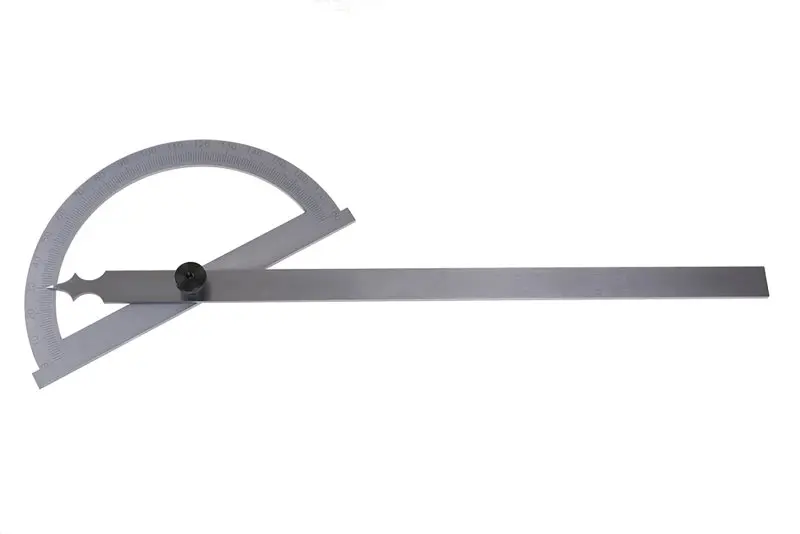 Úhloměr s otočným ramenem, délka základny úhelníku 300mm, délka otočného ramene 500mm, 0 - 180°, možnost aretace naměřeného úhlu pro přenesení. Nerezová ocel, koženkové pouzdro.