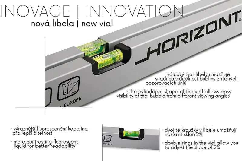 • inovovaná horizontální válcová libela - snadná viditelnost ze všech úhlů pohledu