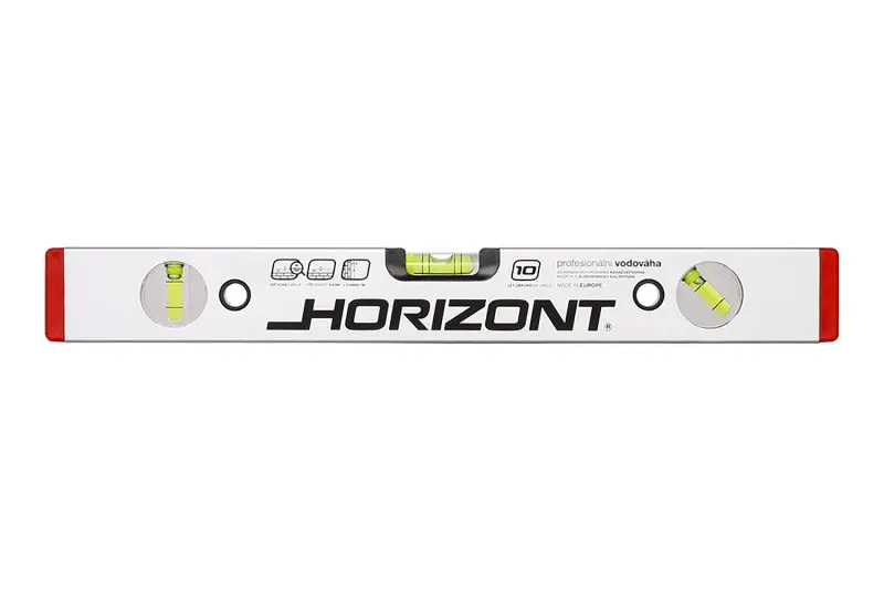 Horizont vodováha se třemi libelami, přesnost 0,5mm/m = 0,0285°, eloxovaný otěruvzdorný povrch, tloušťka stěny ALU profilu 1,5mm, kapalina v libelách je UV stabilizovaná a fluorescenční, horizontální optická libela - usnadňuje a zvyšuje přesnost měření, vodováha je odolná proti provozním nárazům, 10 let záruka na libely, KAŽDÝ KUS ELEKTRONICKY TESTOVÁN.