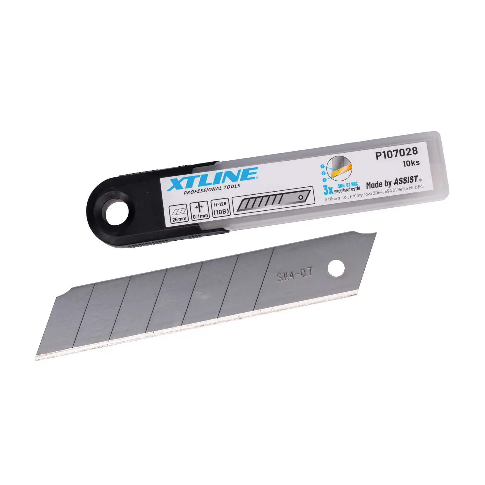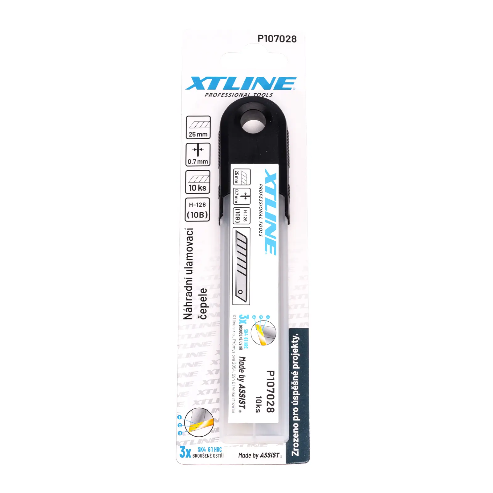 Náhradní čepele do ulamovacích nožů. Balení 10ks v plastové krabičce s okem pro zavěšení. Technologie broušení břitů pod třemi úhly značně zvyšuje životnost břitu.