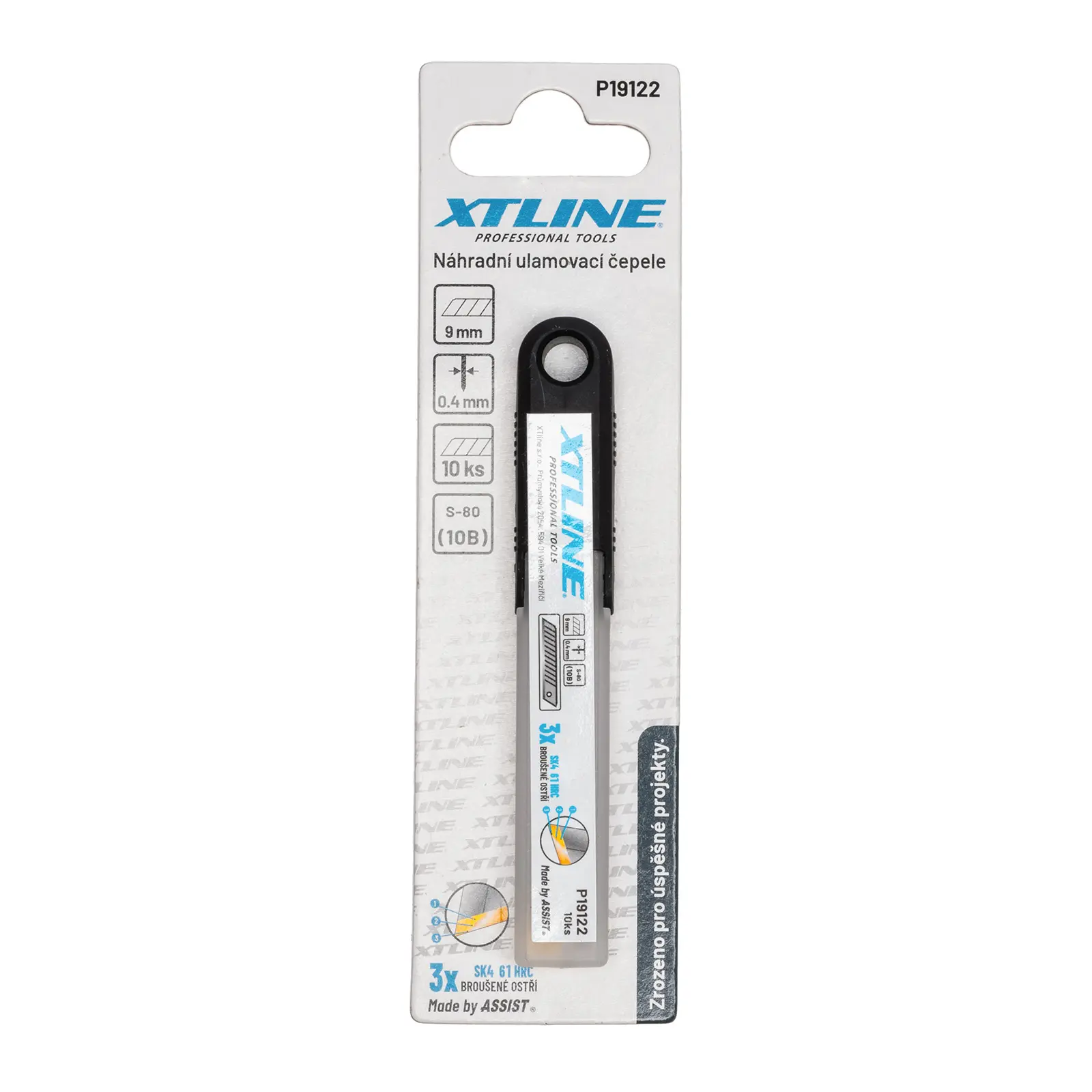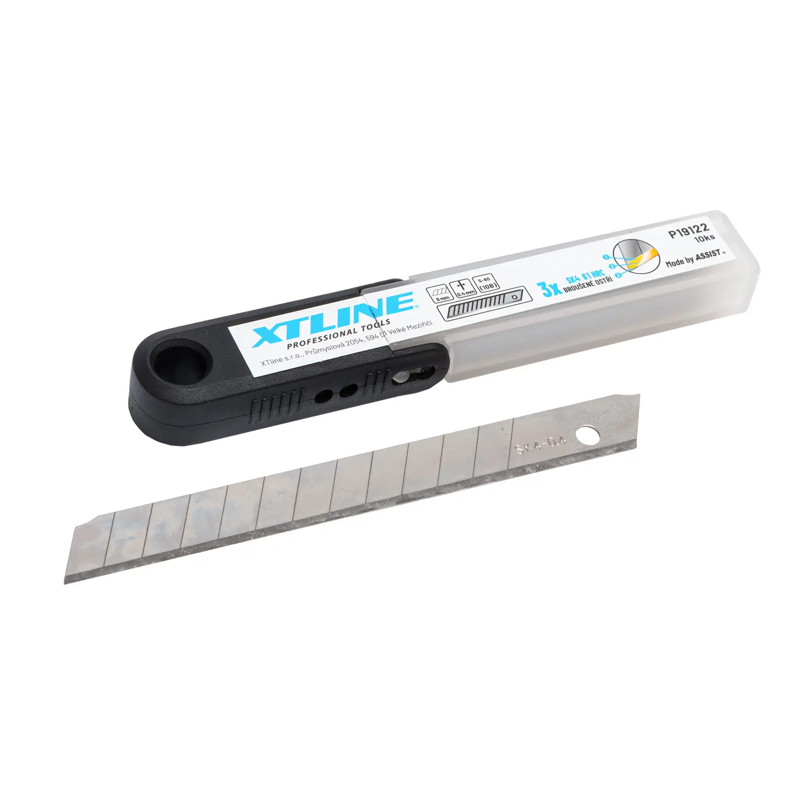 Náhradní čepele do ulamovacích nožů. Balení 10ks v plastové krabičce s okem pro zavěšení. Technologie broušení břitů pod třemi úhly značně zvyšuje životnost břitu.