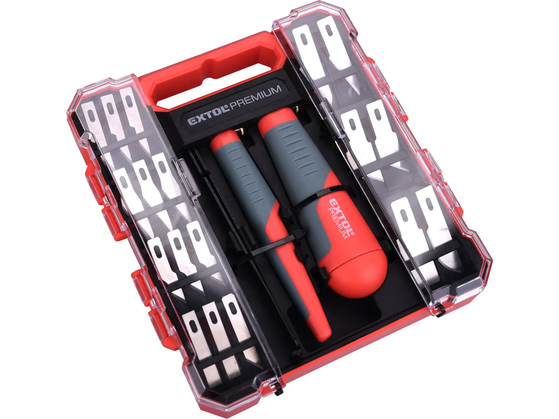 sada obsahuje: větší rukojeť a 6ks 9mm širokých břitů, menší rukojeť s 12ks 6mm širokých břitů a pinzetu