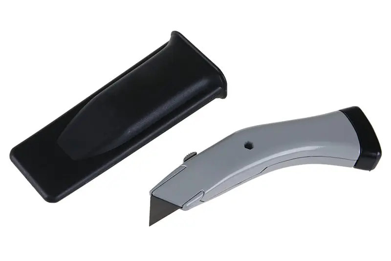Kovový nůž s výsuvnou lichoběžníkovou čepelí, čepel uchycena uvnitř těla nože na posuvném jezdci, ergonomický tvar, dvoupolohová patka umožňuje snadné rozebrání a výměnu čepele, plastové pouzdro s klipem na opasek.