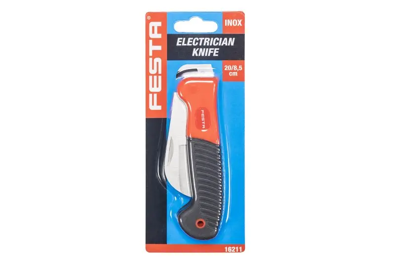 Zavírací elektrikářský nůž se zahnutou čepelí, silná čepel se dvojím ostřím usnadňujícím odizolovávání vodičů, pogumovaná ergonomická rukojeť, blistr.