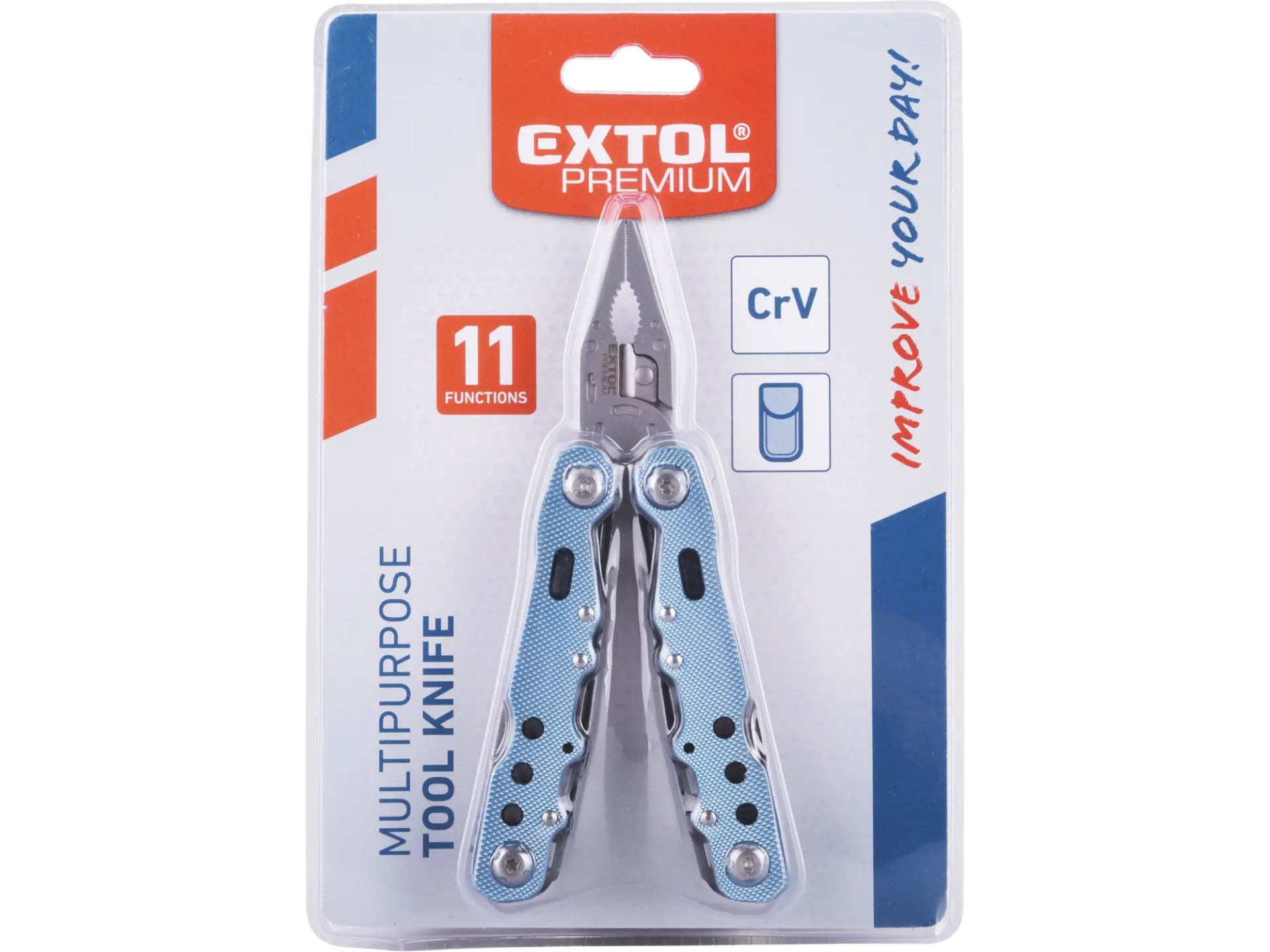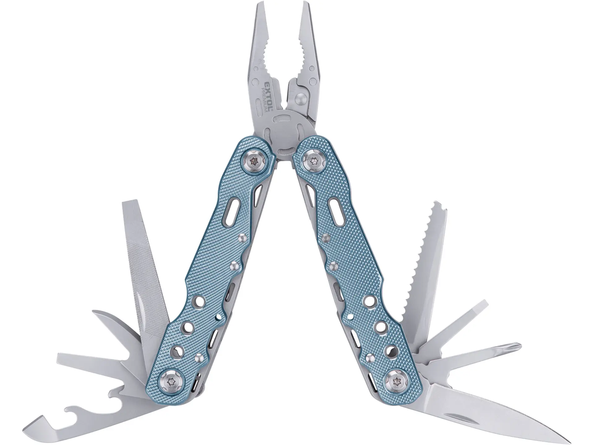 • z nerezové oceli, složení: kleště, pilník+5.5mm plochý šroubovák, pilka, střenka nože, malý nožový bodec,šroubováky PH1+plochý 3mm a 4mm, dva otvíráky (na konzervy+na láhve)