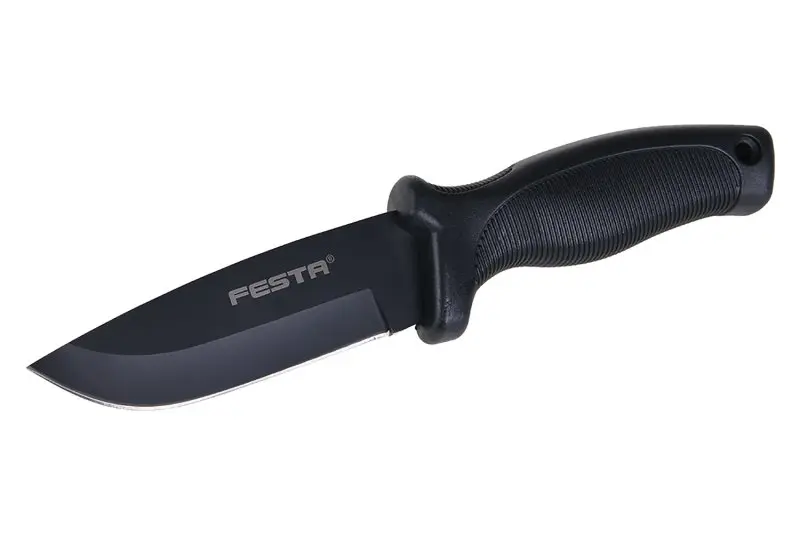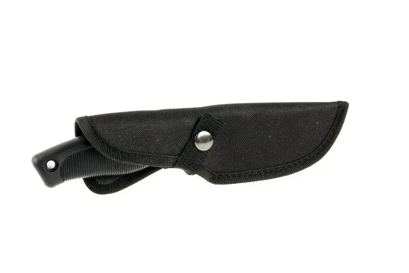 Nerezový lovecký nůž, teflonová povrchová úprava čepele, celková délka 23 cm, ergonomická pogumovaná rukojeť. Nůž není zavírací. Nylonové pouzdro s připnutím na opasek.