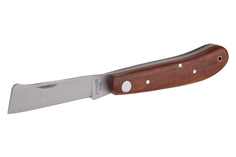 Očkovací zavírací nůž, silná nerezová čepel, dřevěná rukojeť s kvalitním nýtovaním, k očkování - řezání a úpravě dřevin a rostlin, délka čepele 110mm, blistr.
