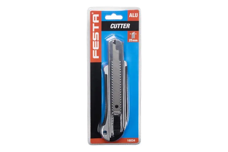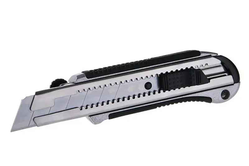 Profesionální odlamovací nůž, přesné zpracování - kvalitní materiály a ergonomie, odolný a přesný posuv s automatickou aretací, pojistná šroubková aretace, šířka čepele 25mm, baleno na blistru.