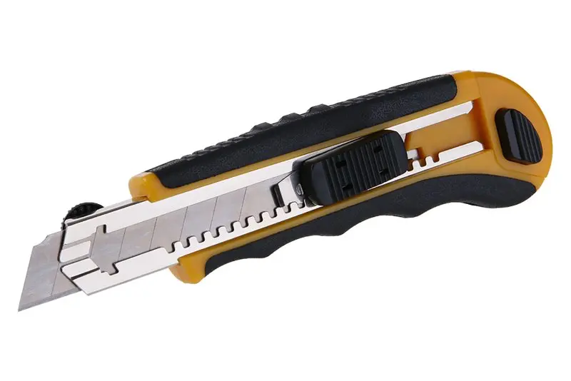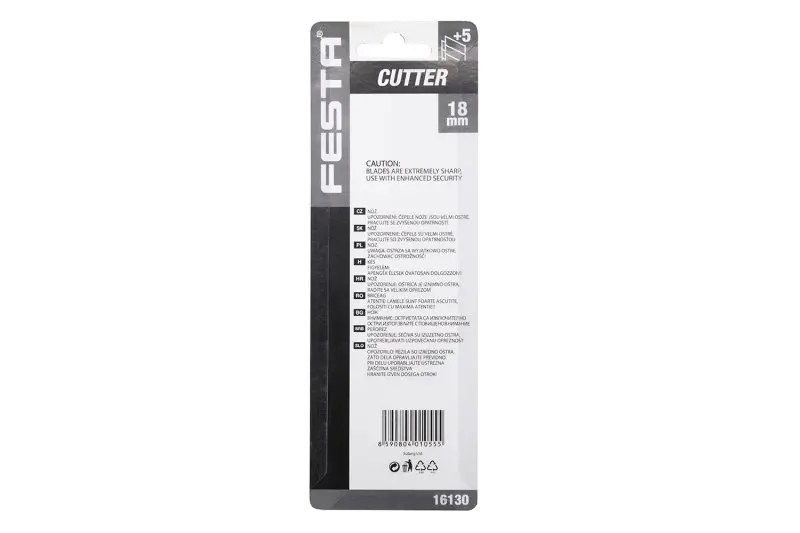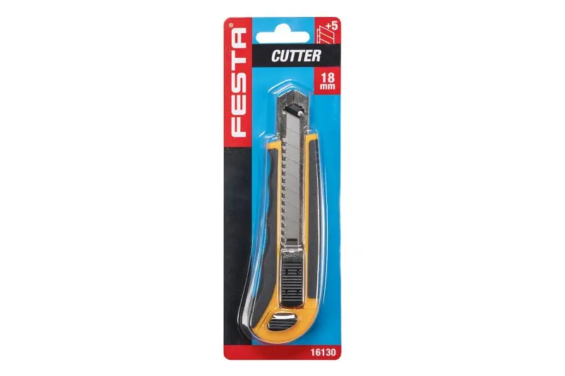 Odlamovací nůž FESTA 18mm, kvalitní materiály, kovová lišta, automatická aretace se šroubkovou pojistkou břitu, 6 náhradních břitů, blistr.