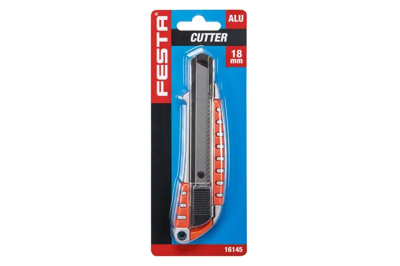 Odlamovací nůž FESTA 18mm, kvalitní materiály, celokovové tělo nože, protiskluzné plastové výstupky, kovová lišta, automatická posuvná aretace, do nože lze umístit až 2 náhradní břity, blistr.