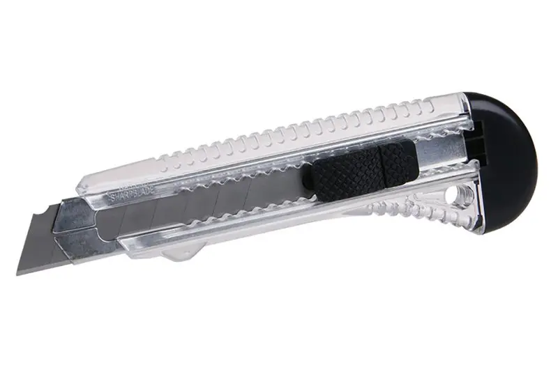 Odlamovací nůž, ocelová vodící lišta, tlačítkový posuv s aretací, 18mm.