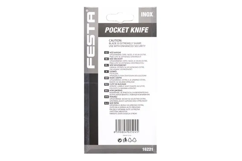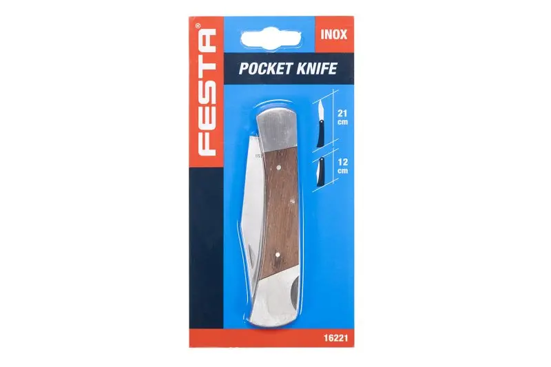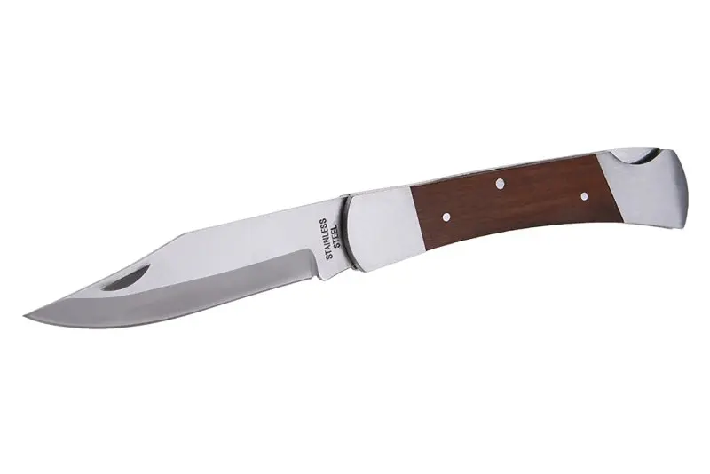Kapesní zavírací nůž s pojistkou proti samovolnému zavření čepele, čepel z nerezové oceli, dřevěná rukojeť, kvalitní nýtování, délka čepele 120mm, blistr.