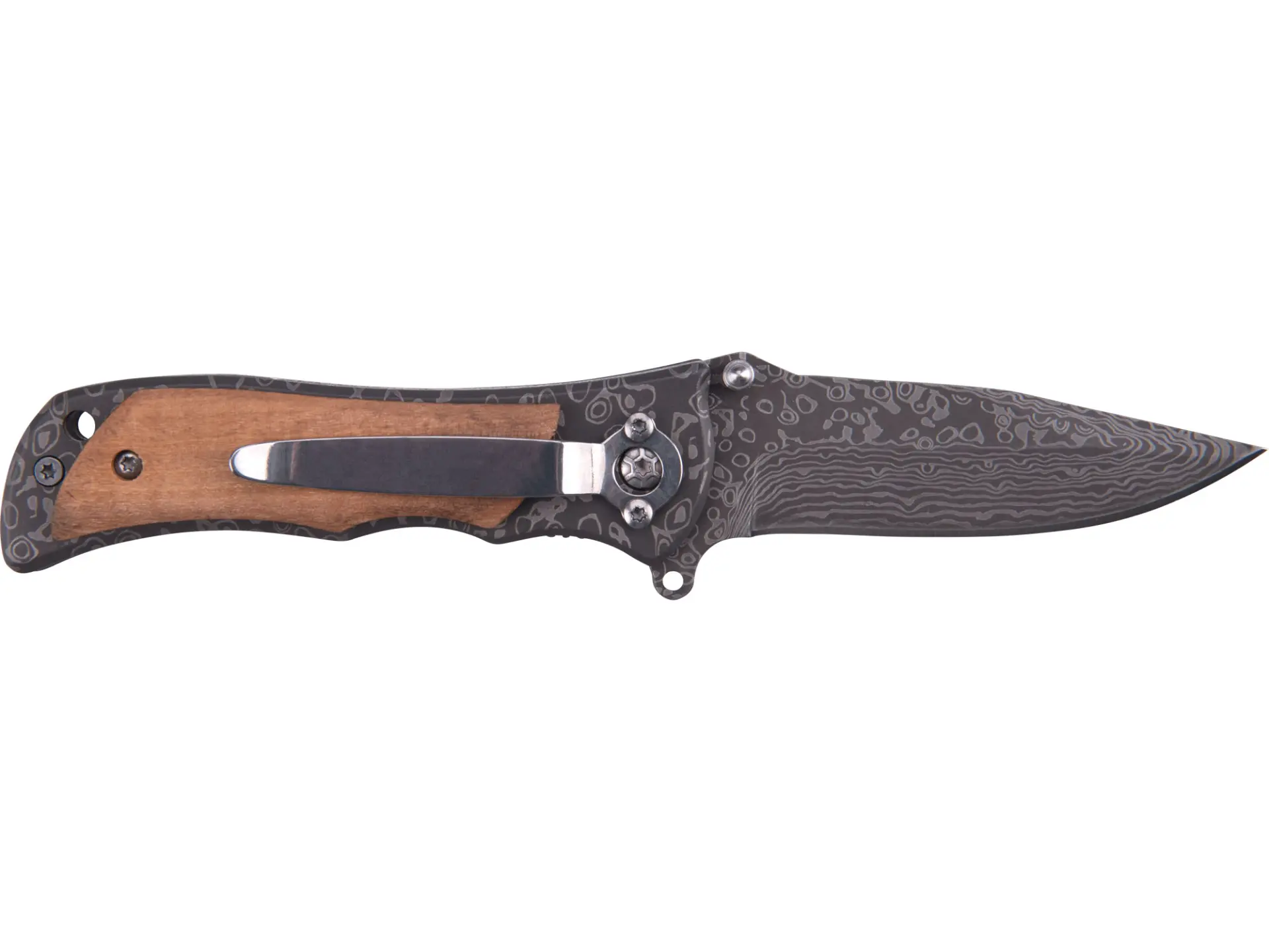 • čepel z nerezové oceli v titanově šedé barvě s laserovanými konturami ve stylu damašské oceli