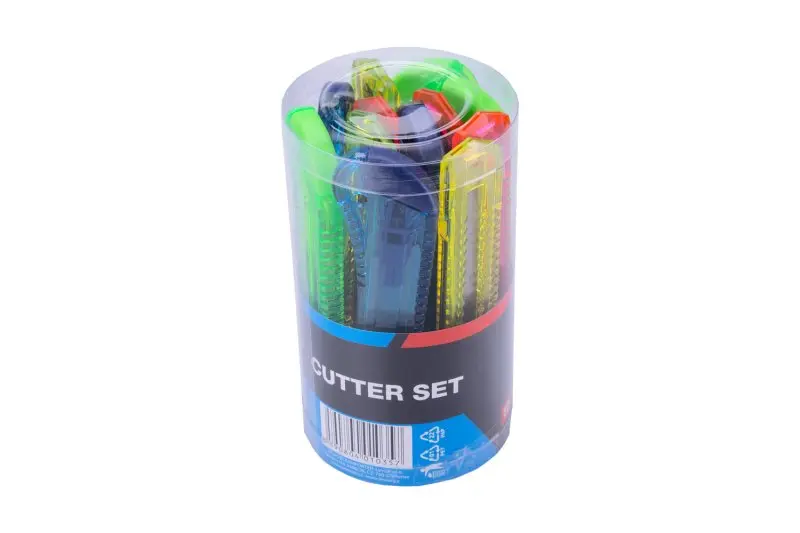 Sada plastových odlamovacích nožů 18mm, 12ksů, plastová kruhová dóza, barevný mix.