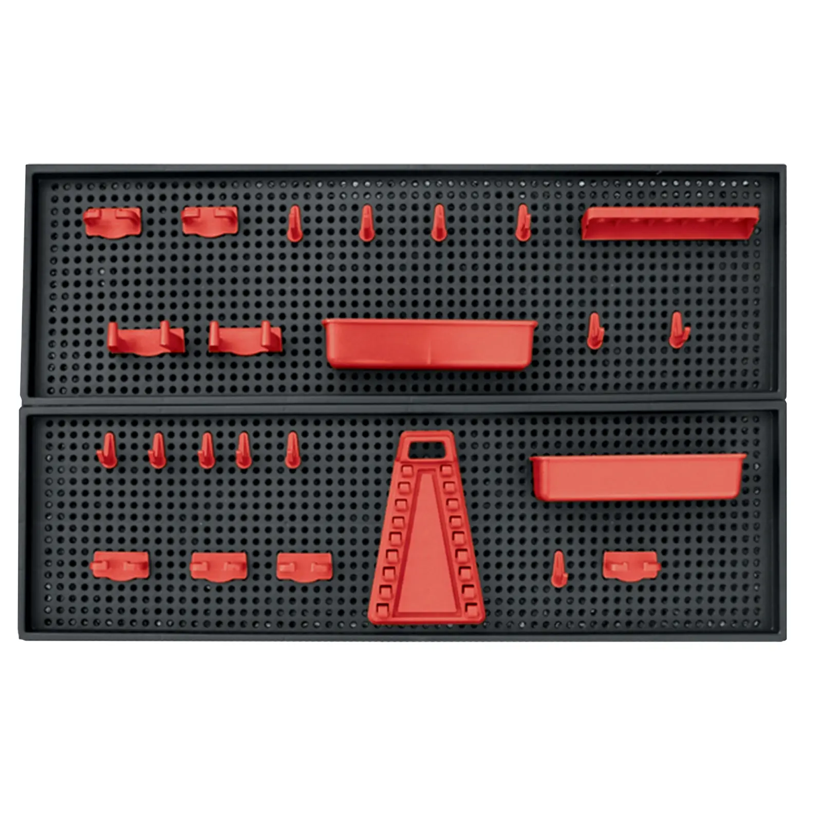 Plastový držák nářadí pro připevnění na stěnu s háčky a klipy pro snadné a rychlé uložení nářadí po práci.
