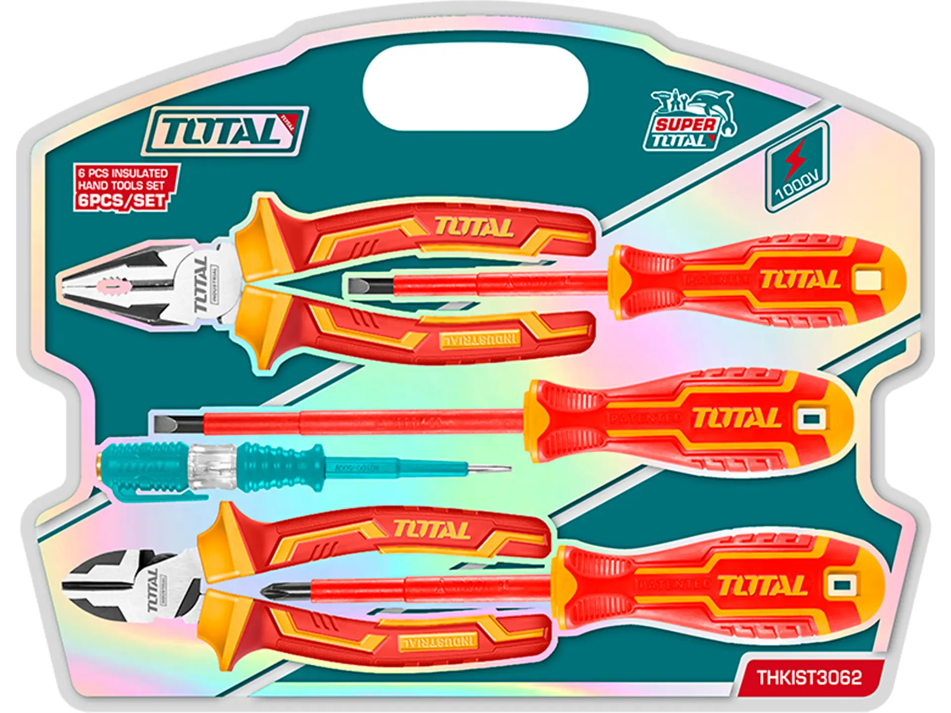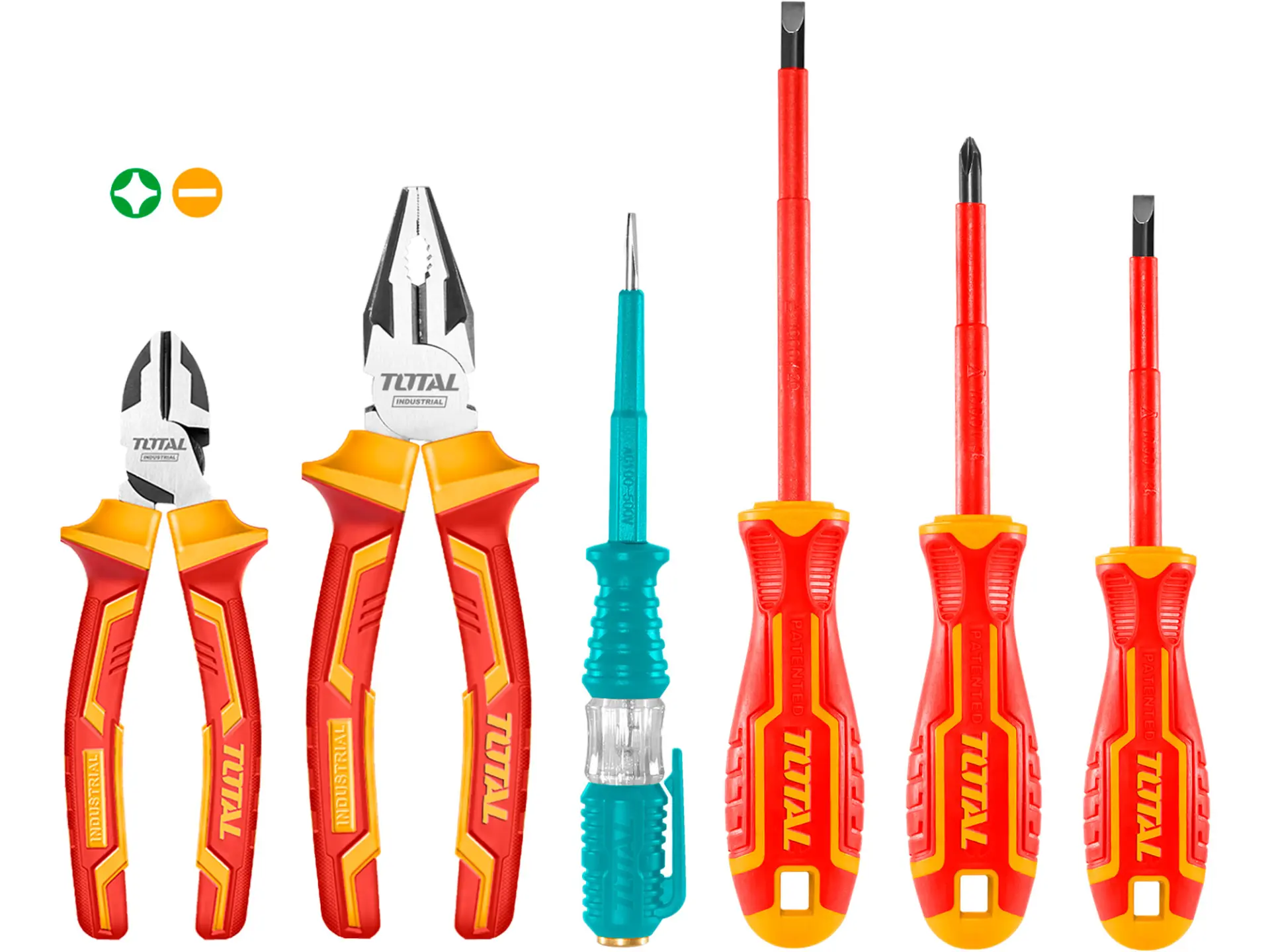 Sada 6 kusů izolovaného ručního nářadí:1ks SL5,5x125mm Izolační šroubovák1 ks SL4,0x100mm Izolační šroubovák1 ks PH2x100mm Izolační šroubovák1 ks 180cm izolované kombinované kleště1 ks 160cm izolované diagonální štípací kleště1 ks zkoušečka napětí (zkušební napětí: 100-500VAC)Industriální kvalita.