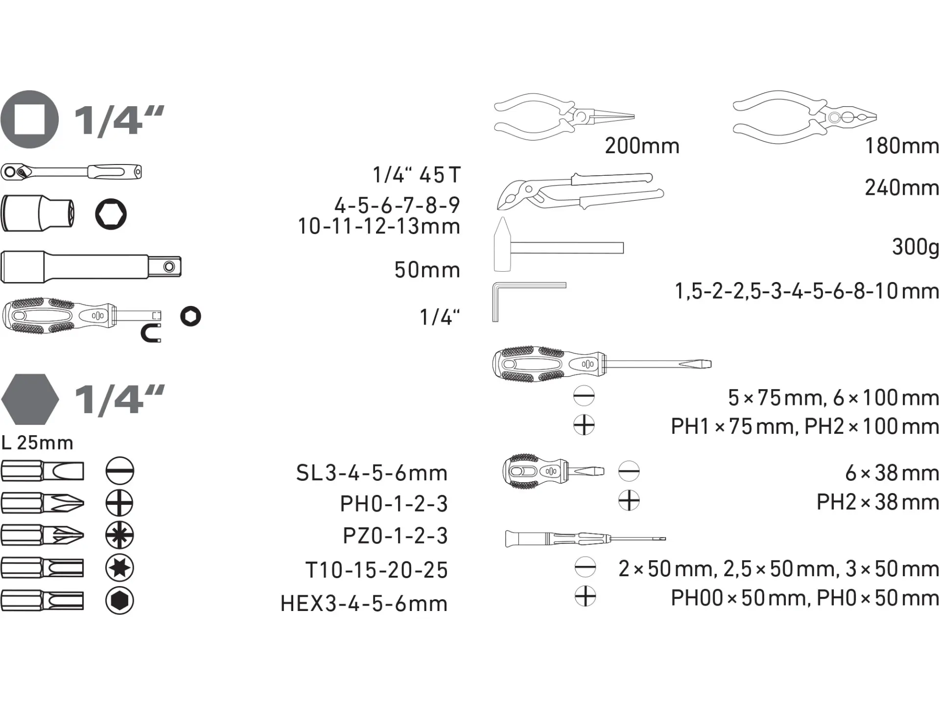 1/4"(L25mm): (-)3-4-5-6, PH0-1-2-3, PZ0-1-2-3, H3-4-5-6mm, T10-15-20-25 (CrV)