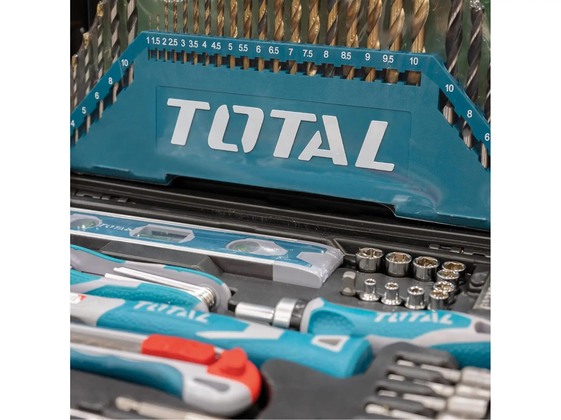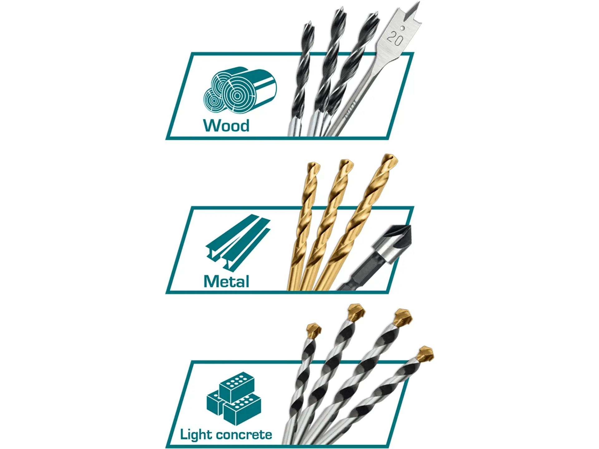 kladivo, vodováha mini, hex klíče, nůž ulamovací, vrtáky do zdiva, kovu a dřeva, hroty, držák hrotů, hlavice, držák na hlavice