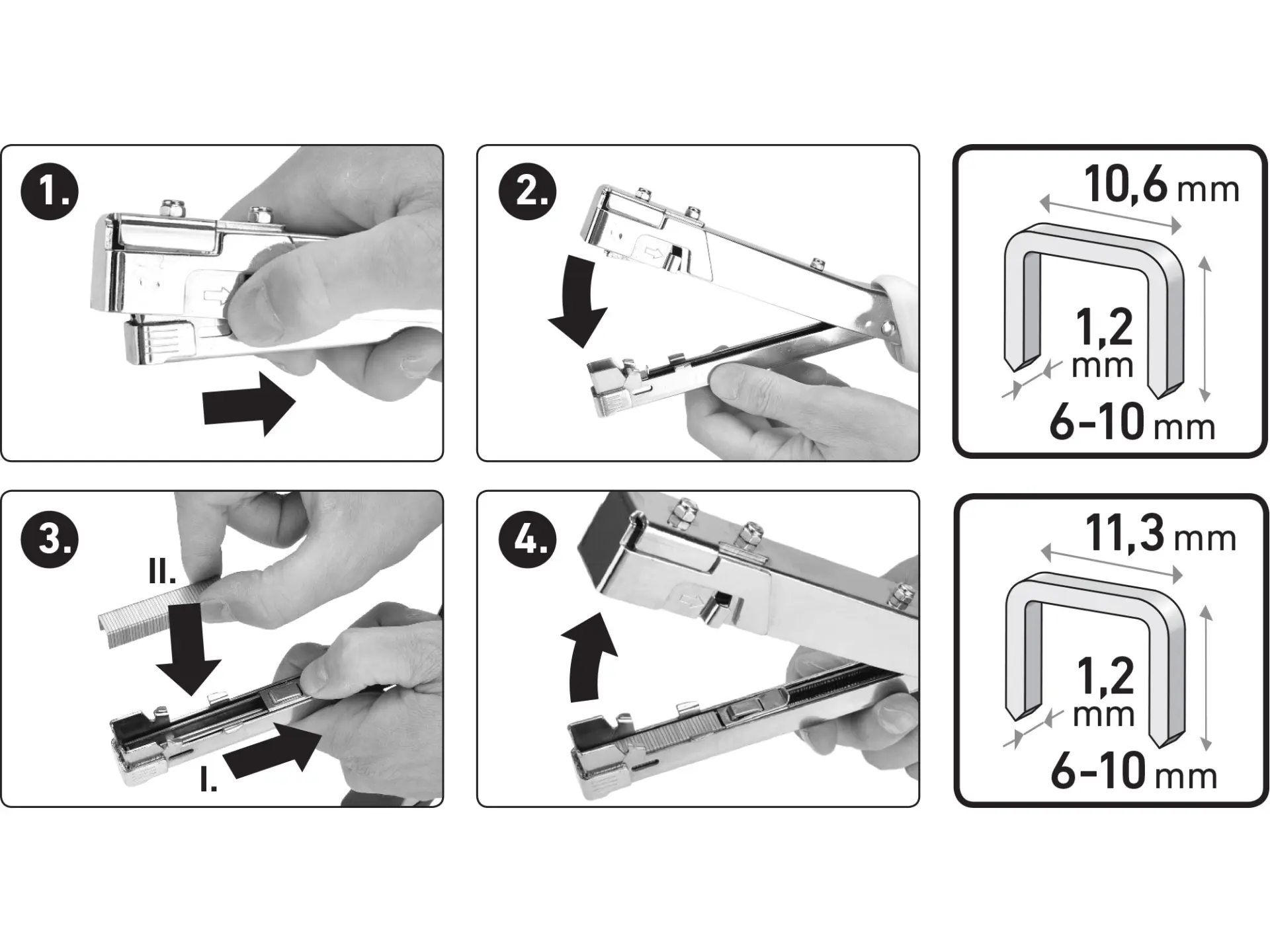 vhodné pro spony: výška 6-10mm, rozteč 10,6x tl.1,2mm+ rozteč 11,3x tl.1,2mm, váha cca 490g