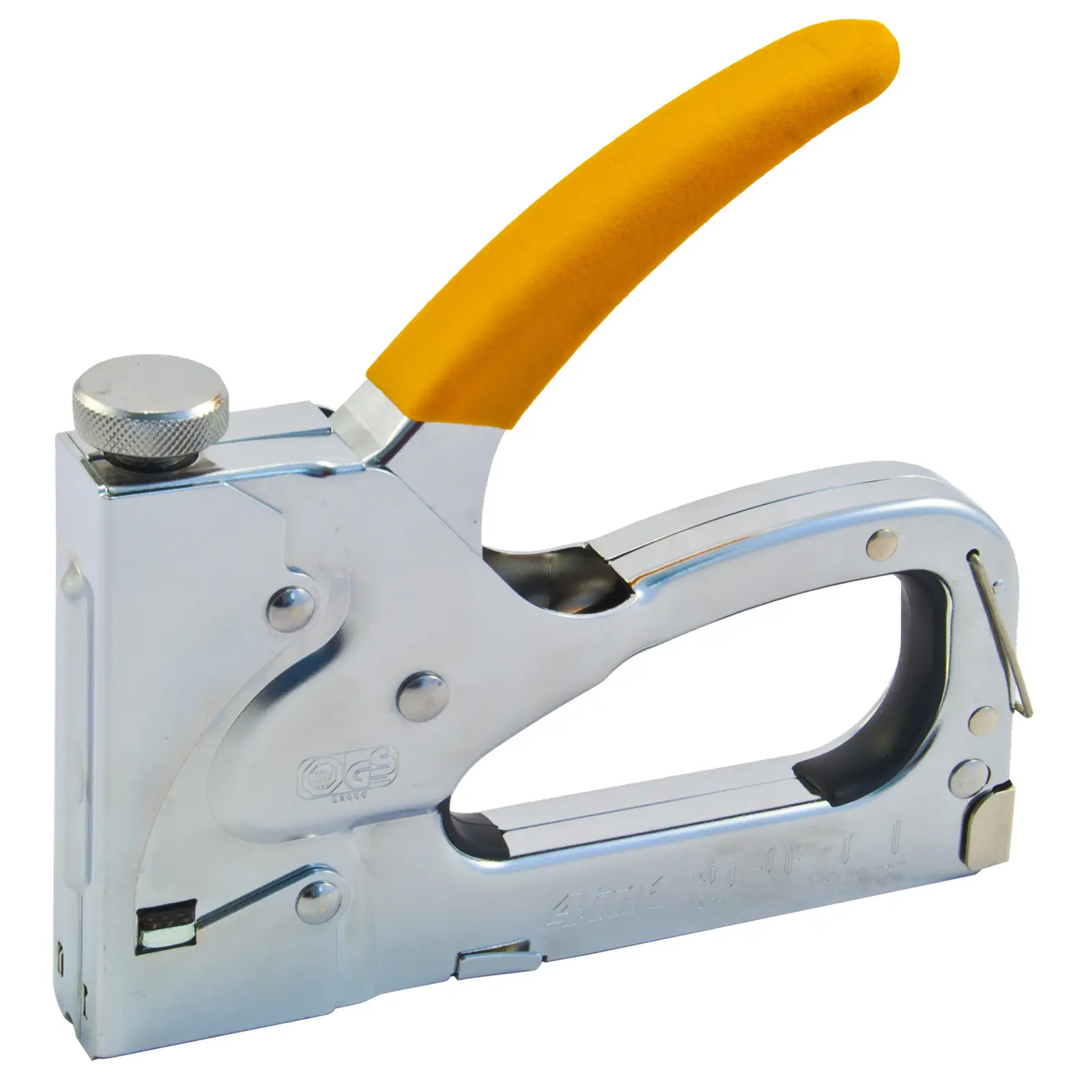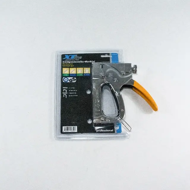 Profesionální celokovová sponkovačka umožňuje pracovat se 4 druhy sponek - čalounické sponky, hřebíky, kolíky a kabelové sponky. Splňuje certifikát TÜV a tím zaručuje bezpečnost výrobku. Všestranné použití do dílny, stavbu i domácnost. Možnost nastavení síly úderu dle materiálu pomocí šroubu. Je pomocníkem pro snadnější práci, což zajišťuje velký zásobník s rychlým plněním. Na sponkovačce najdete šroub pro nastavení síly úderu. Pogumovaná rukojeť umožňuje pohodlnější práci.
