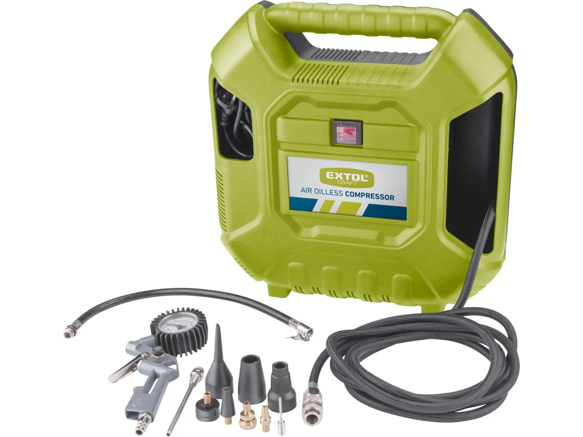 Bezolejový pístový kompresor je určen pro plnění pneumatik automobilů, motocyklů či kol a další drobné práce v domácnosti a domácím prostředí. Díky mnoha různým dodávaným koncovkám určených k připojení na hadici plniče lze rychle a bez námahy nafouknout objemná nafukovací lehátka, postele, čluny atd., přiloženou jehlou pak sportovní míče, cvičební balóny apod. Plnič pneumatik je vybaven integrovaným tlakoměrem a upouštěcím ventilem. Lze na něj také našroubovat ofukovací nástavec. Dále je vhodný pro drobné práce se stříkacím, čistícím, nýtovacím, hřebíkovacím a sponkovacím nářadím. Hadice je pokryta tkaninou, která omezuje kroucení a příjemně se s ní pracuje. Díky 5m napájecímu kabelu a 3m tlakové hadici nabízí kompresor pohodlný pracovní radius. Kabel, hadice a veškeré příslušenství lze uschovat v těle kompresoru. Gumové přísavky na spodní straně kompresoru tlumí vibrace přenášené do podlahy a stabilizují kompresor během provozu.