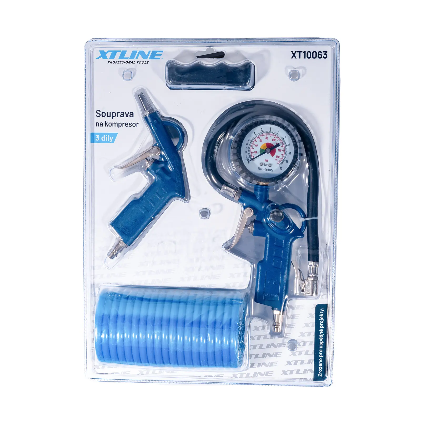 Základní sada pro kompresor k huštění pneumatik a čistění stlačeným vzduchem pomocí ofukovací pistole.