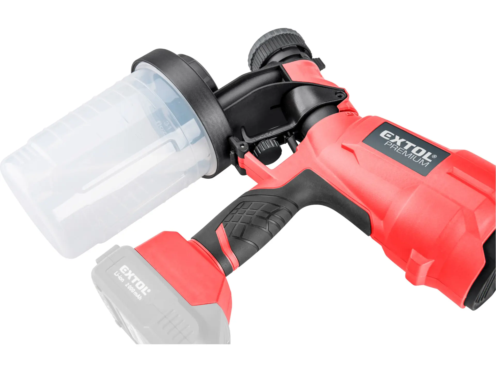 HVLP aku stříkací pistole je ideální pro stříkání barvy doma, na chalupě či v zahradě. Vyšší výkon jí dovoluje používat hustější typy barev nebo méně ředěné barvy, čímž je možno zrychlit práci. Stříkací pistole umožňuje regulovat množství nanášené barvy a má 3 tvary nanášejícího paprsku – horizontální a vertikální paprsek a kruh/bod. Lze použít pro nanášení těchto barev a tekutin: plastických a latexových barev, vodou ředitelných barev, základových a emailových barev, barev na bázi oleje nebo hliníku, krycích laků, uzavíracích nátěrů pro automobily nebo dřevo, mořidel, konzervantů na dřevo, prostředků na ochranu dřeva a rostlin, desinfekčních prostředků. Nádoba na barvu má objem 900ml a díky jejímu designu lze doplňovat barvu bez její demontáže. Pogumovaná rukojeť je příjemnější, lépe se drží a zmenšuje únavu při práci. Pro běžnou práci dostačují jeden nebo dva 2000mAh akumulátory, které můžete rychle nabít v rychlonabíječce, pro náročnější nebo delší práci doporučujeme větší akumulátory s kapacitou 4000–8000mAh. Akumulátor lze použít ve všech typech nářadí řady EXTOL SHARE20V. Díky použité Li-ion technologii je ho možné kdykoliv dobíjet, aniž by se tím snižovala jeho kapacita. Li-ion akumulátor ztrácí energii vlivem samovybíjení velmi pomalu a vydrží dlouho nabitý a připravený k použití.