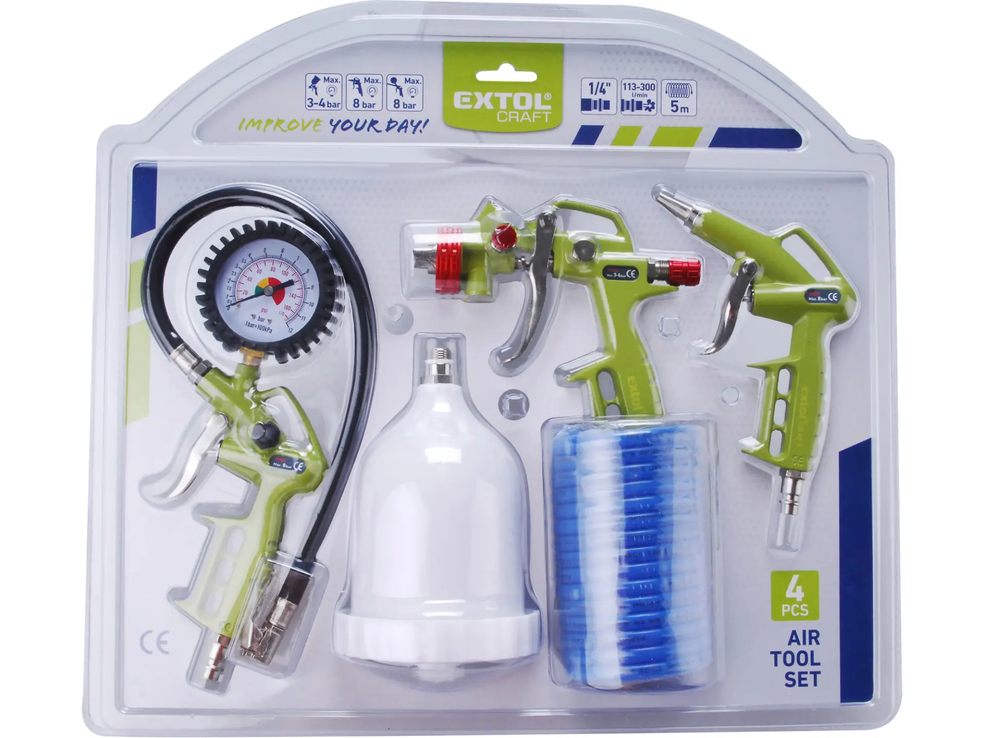 max. 8bar (0,8MPa), pistole ofukovací, plnič pneumatik s manometrem, pistole stříkací, spirálová hadice 4m s rychlospojkami