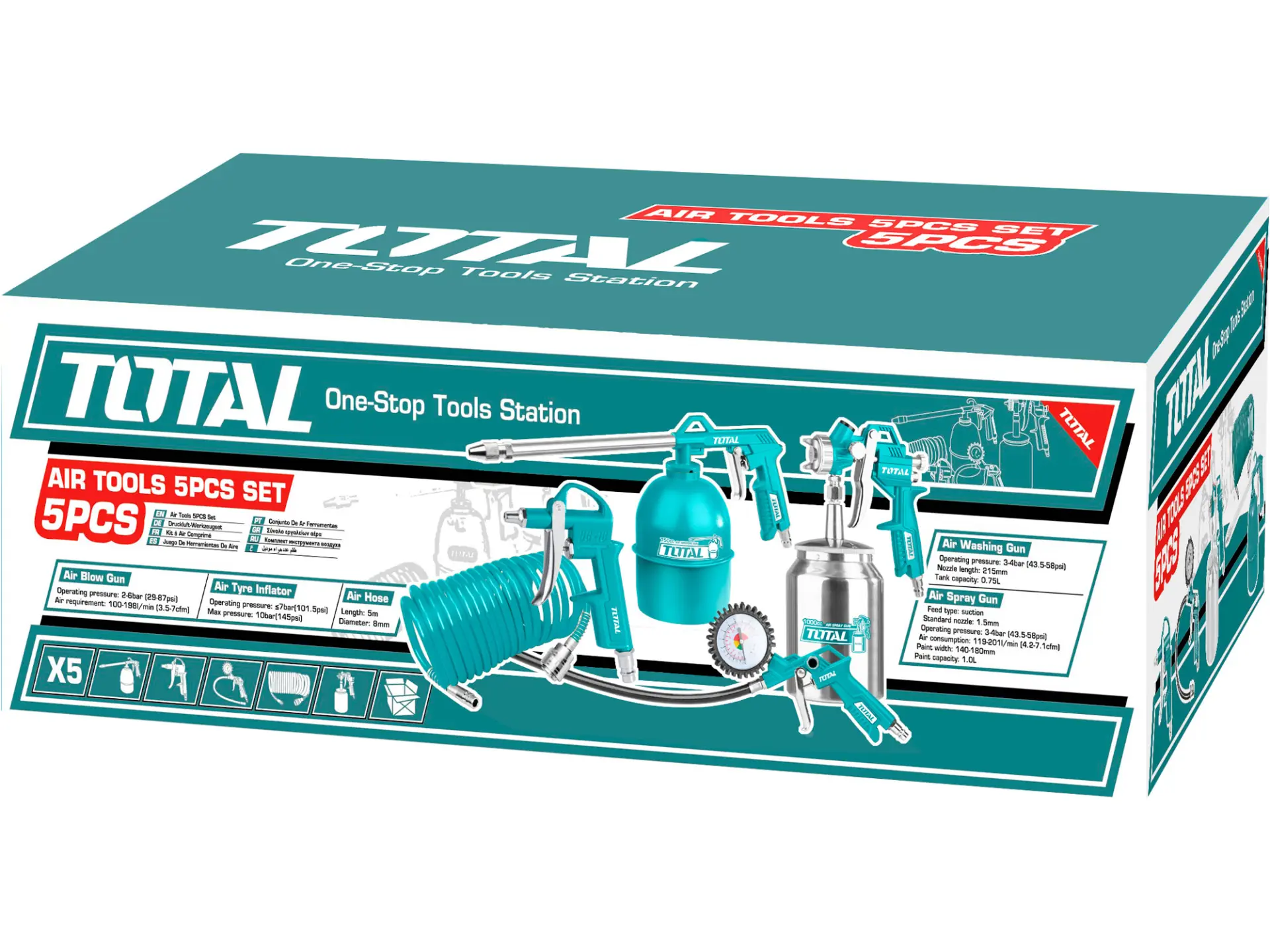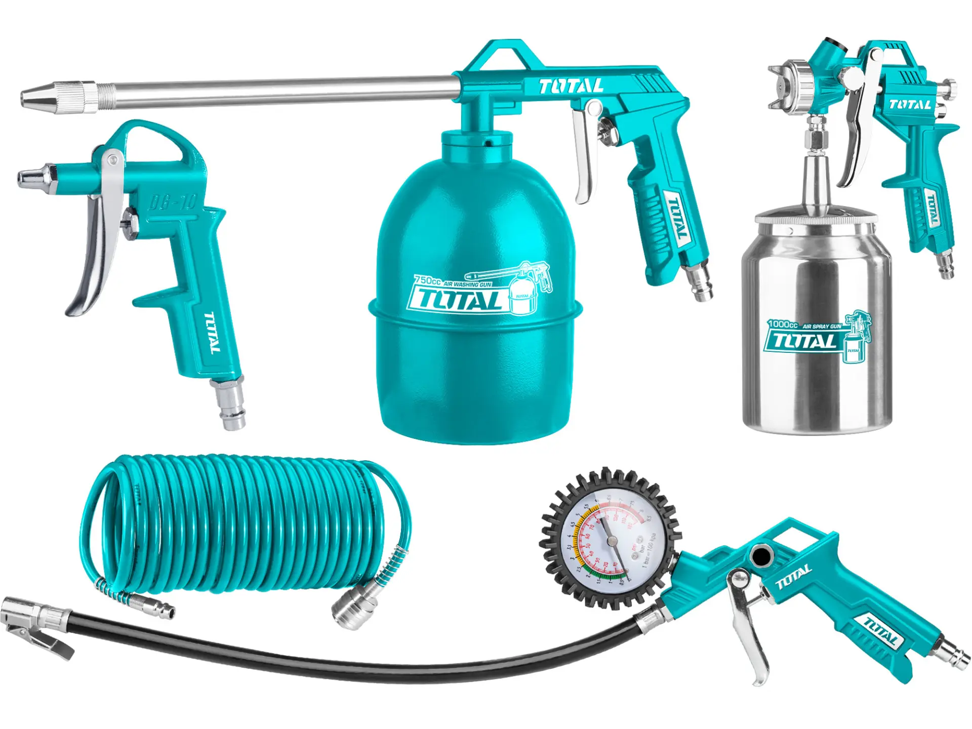 Délka vzduchové spirálové hadice 5m, průměr 8mm, pistole ofukovací, pistole stříkací se spodní nádobkou, plnič pneumatik s manometrem, pistole mycí