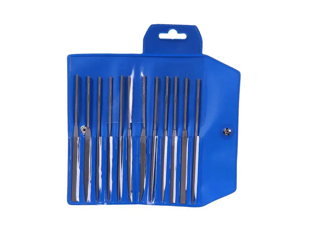 Sada 12 jehlových pilníků v délce 140 mm. V seku 2 (hrubost: 31 z/cm). Sada obsahuje: plochý, plochošpičatý, čtyřhranný, tříhranný, kruhový, úsečový, nožový, tříhranný nízký, jazýčkový, mečový, plochý se zaoblenými rohy a oválový.