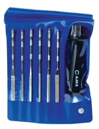 Sada jehlových pilníků s diamantovým povrchem. V sadě šest pilníků (plochý, čtyřhranný, trojhranný, kruhový, úsečový a nožový) a plastové držadlo. Diamantové jehlové pilníky pro ruční dokončovací operace při výrobě střížných, lisovacích a jiných nástrojů, které jsou vyrobeny z kalené oceli nebo slinutých karbidů. Pilníky jsou vhodné i pro uměleckou činnost a mají široké použití i pro drobné řemeslníky.