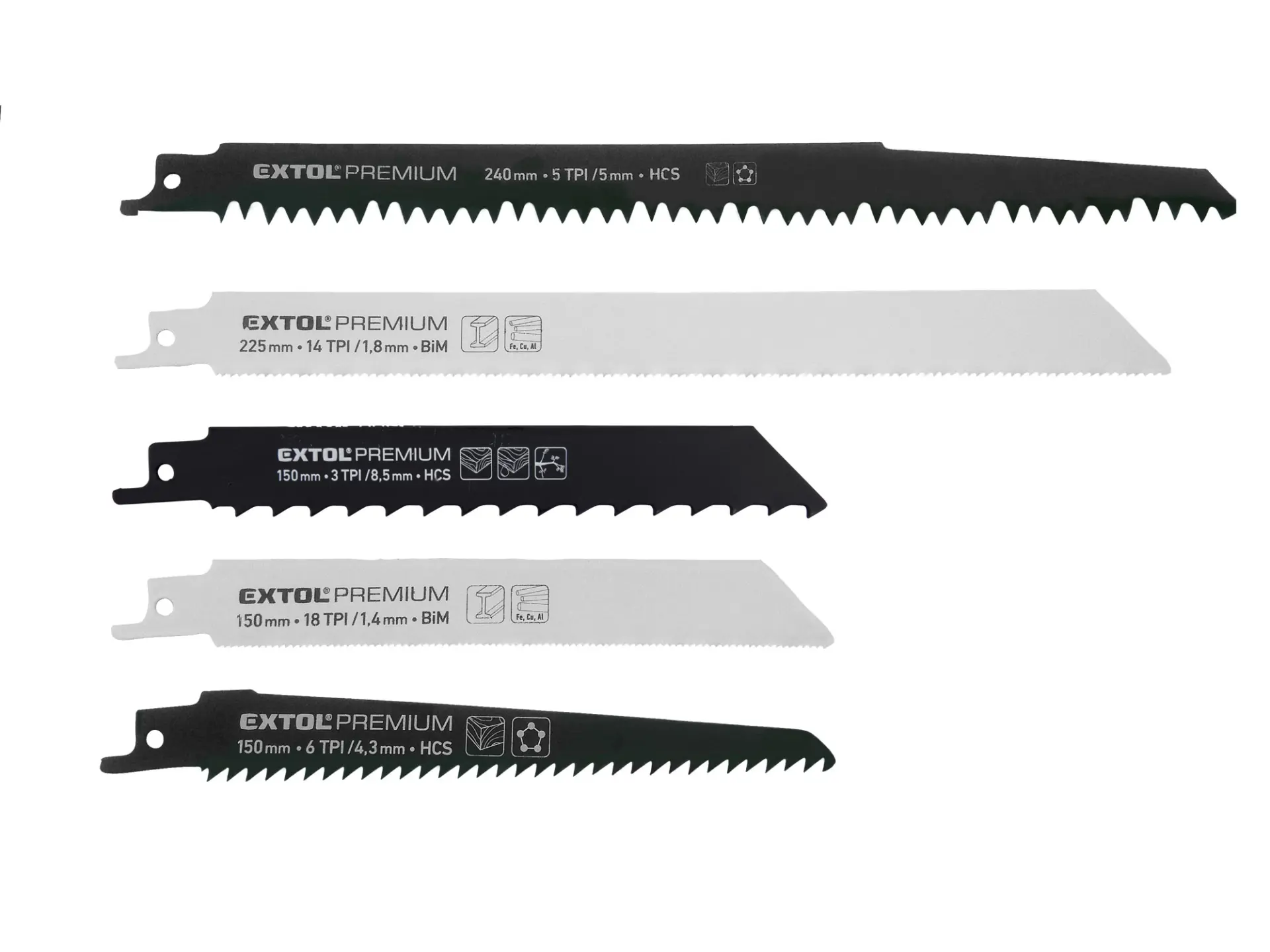 použití: 3 plátky vhodné na řezání různých typů dřeva, materiálu na bázi dřeva a plastů; 2plátky pro řezání plechů, kovových trubek a tenčích profilů