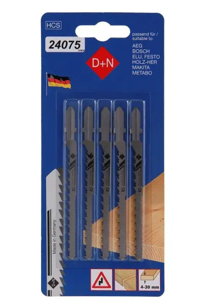 Materiál:WS ocel Pracovní délka 75mm Tlouštka: 1,45mm Rozteč zubů: 2,5mm/1,2mm Typ ozubení: Podbroušené Úchyt: Bosch Použití:tvrdé a měkké dřevo, překližka do tl. 60mm, dřevotříska, pro řezání oblouků o malém poloměru, plasty do tl. 30mm Čistý řez/Řez oblouků.