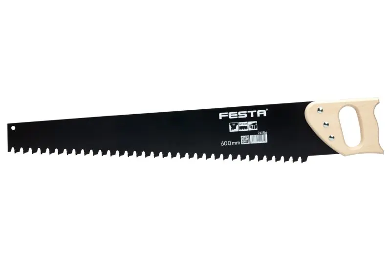Ergonomická masivní dřevěná rukojeť. Tuhý ocelový list s břitovými destičky ze slinutých karbidů zaručující dlouhodobý řezný výkon. Počet osazených zubů: 34, pracovní délka: 600mm, použití: profesionální pila pro řezání pórobetonových bloků.