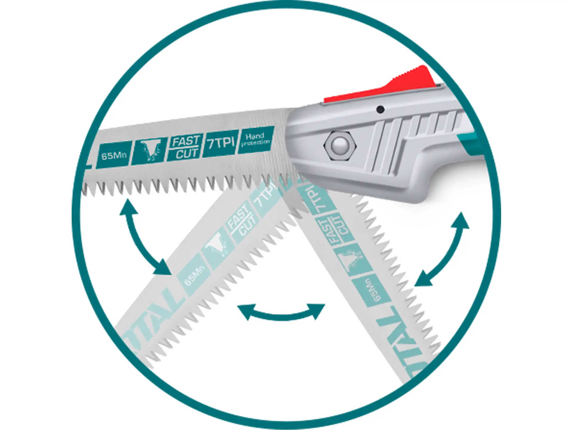 180mm dlouhá skládací pila. Materiál 65Mn. Standardní zuby 7TPI, trojité zuby (přesně broušené 3hranné zuby), fast cut.