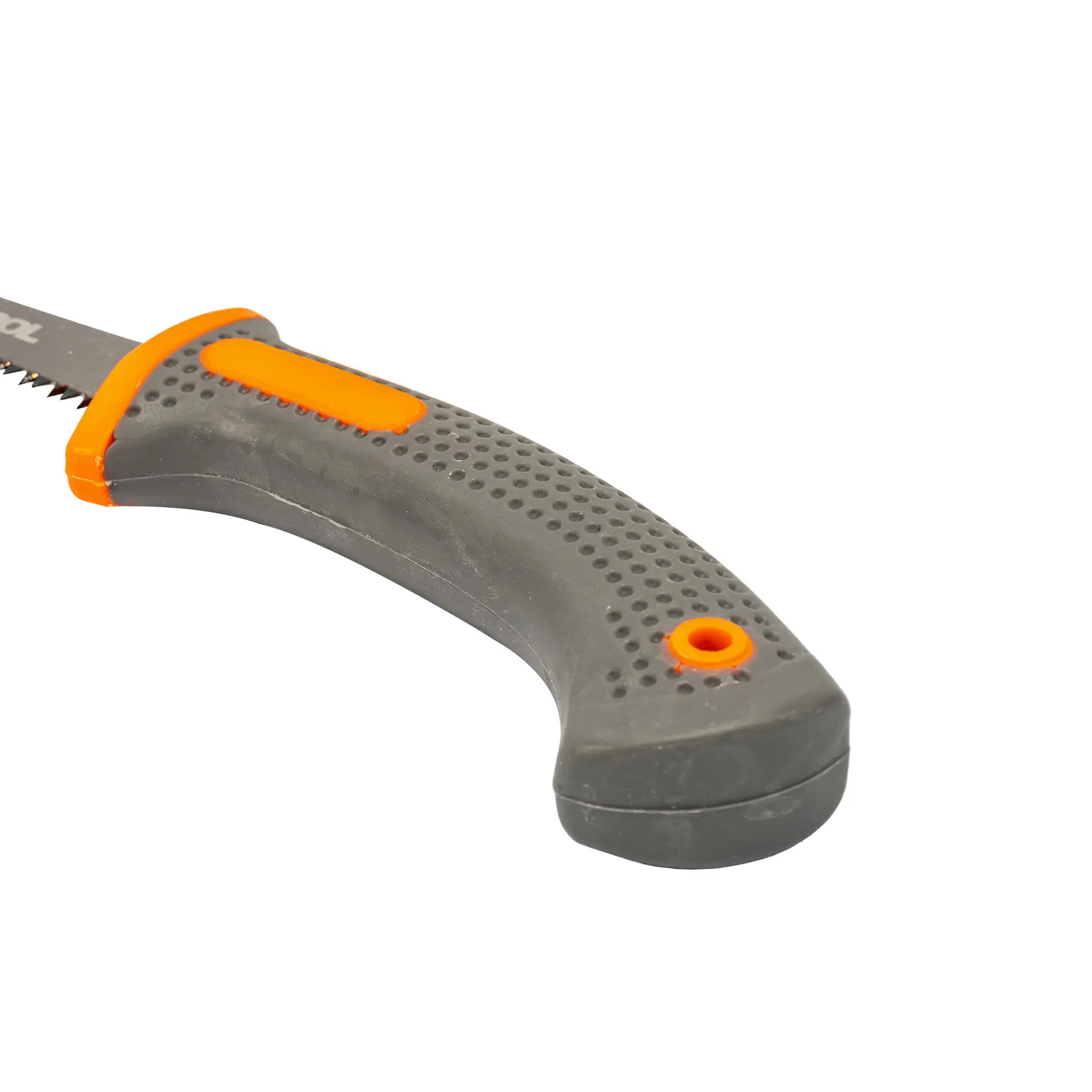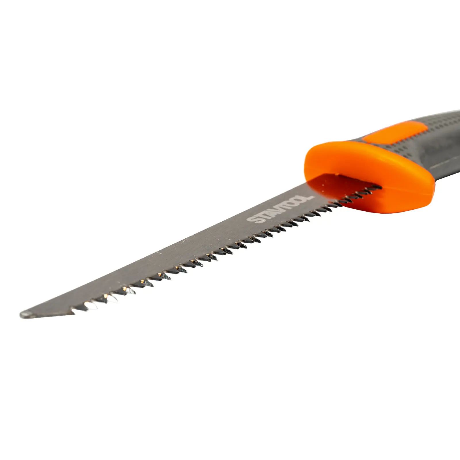 Ruční malá pilka na dokončovací práce se sádrokartonem, dvousložkové držadlo, tenké zúžené ostří, ozubení až po hrot listu.