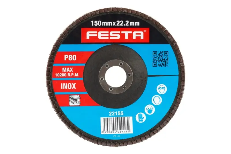 Zrnitost: 80 Druh Zrna: oxid zirkoničitý Pojivo: umělá pryskyřice Podkladový materiál: pružná tkanina-100% bavlna (240-260g/m2) Provedení: vyhnutý vnitřní průměr: 22,2mm Max. Pracovní rychlost: 80m/s Max. přípustné otáčky: 10200 1/min.