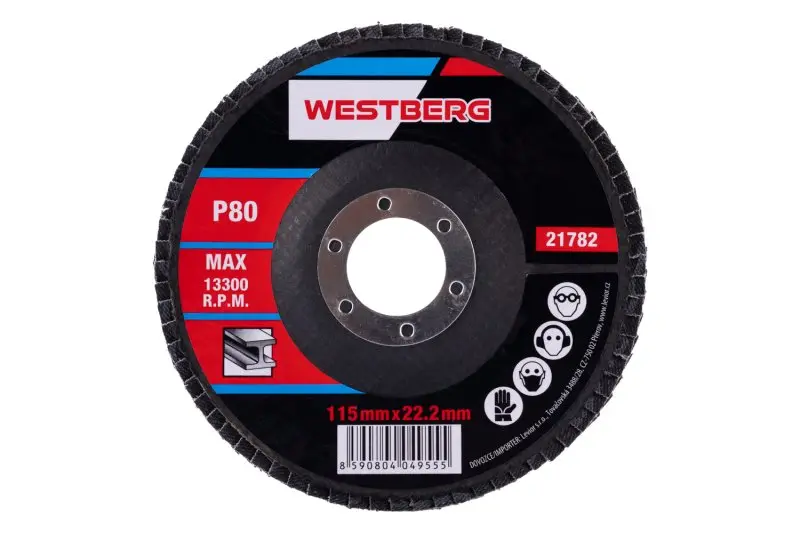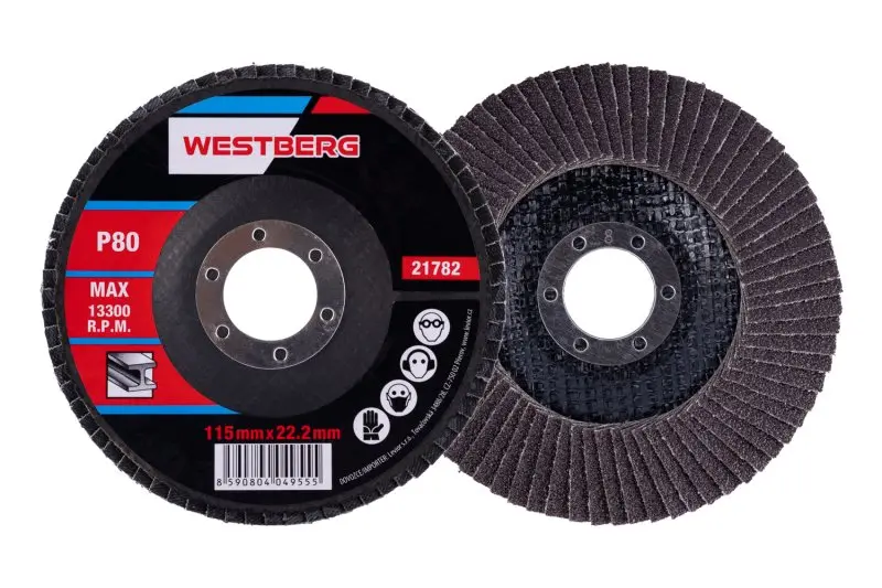 Lamelový kotouč, zrnitost: 80 druh zrna: oxid hlinitý pojivo: umělá pryskyřice podkladový materiál: pružná tkanina - 100% bavlna (240-260g/m2) provedení: vyhnutý otvor : 22,2mm, max. pracovní rychlost : 80m/s, max. přípustné otáčky: 13300 1/min, použití : broušení, obrušování, odrezování, odstraňování nátěrů, ...., rozměry : uvedeny v názvu výrobku.
